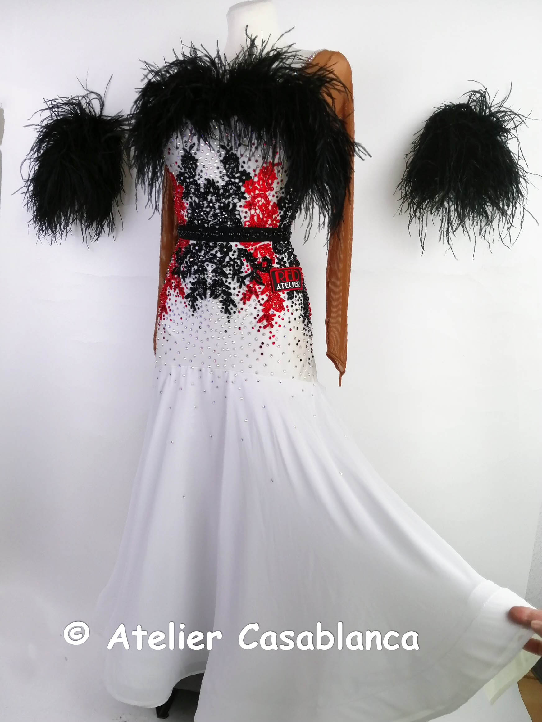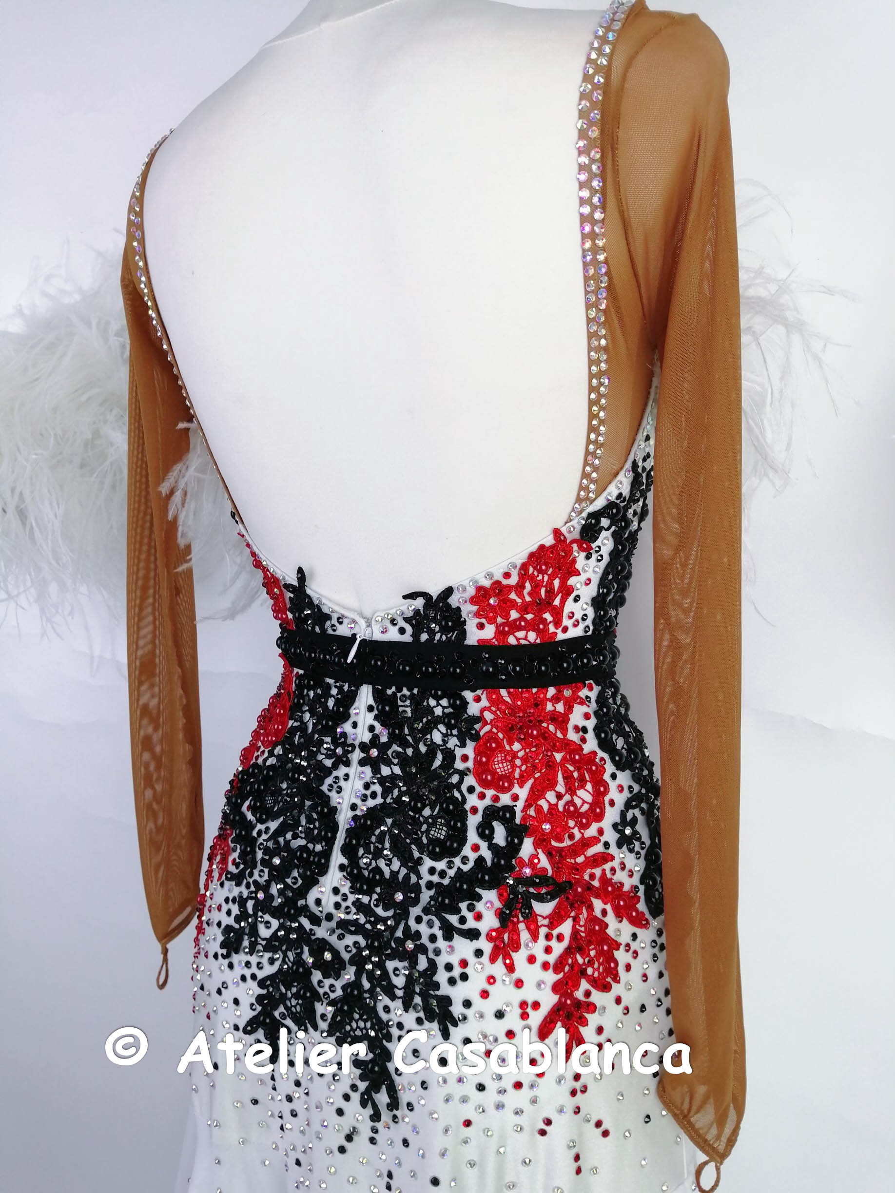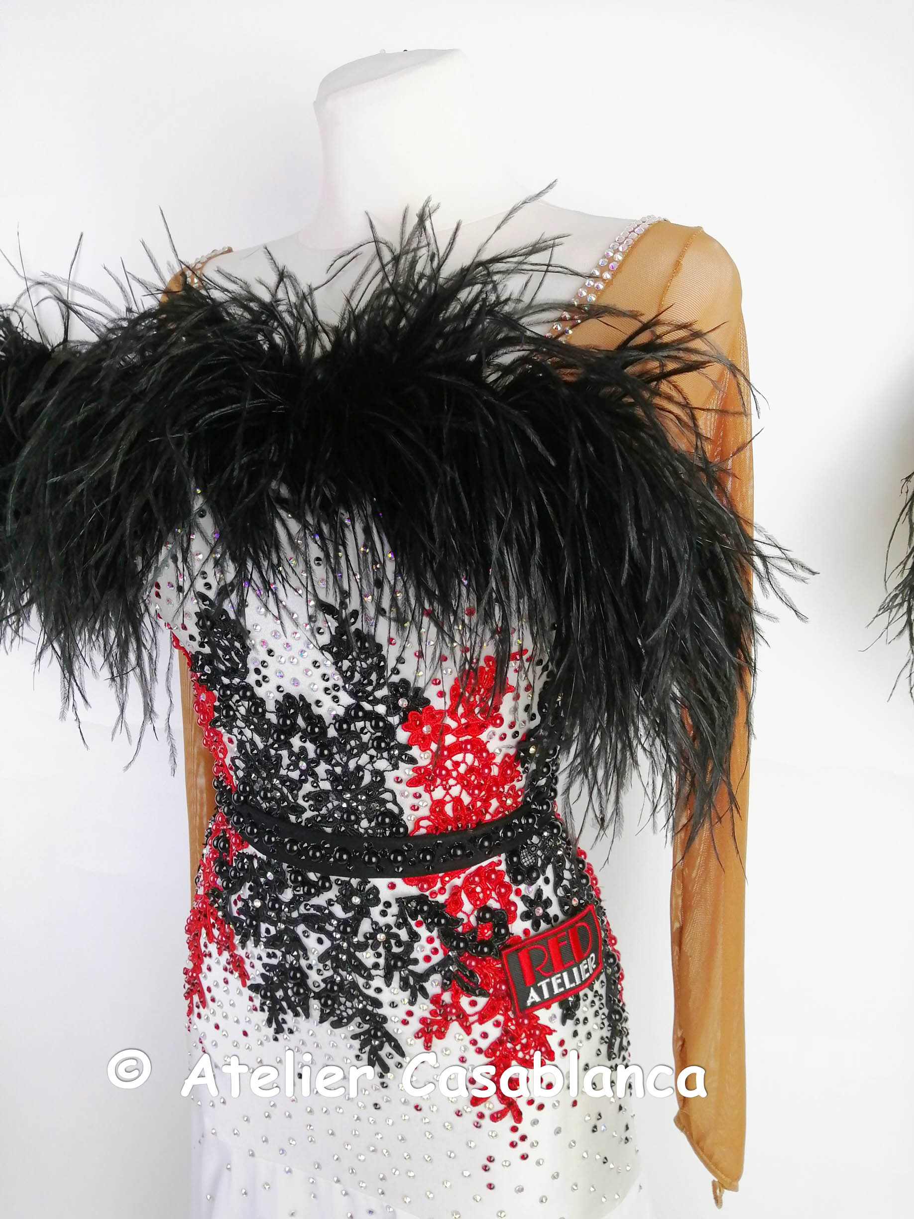 ロシアの大変素晴らしいダンスドレスブランド、「レッドアトリエ」が制作した、ボディの赤と黒のレースモチーフ使いが大変美しい、黒と白のオーストリッチの羽の飾りをボタンでチェンジすることができ長袖のスタンダードドレスです。