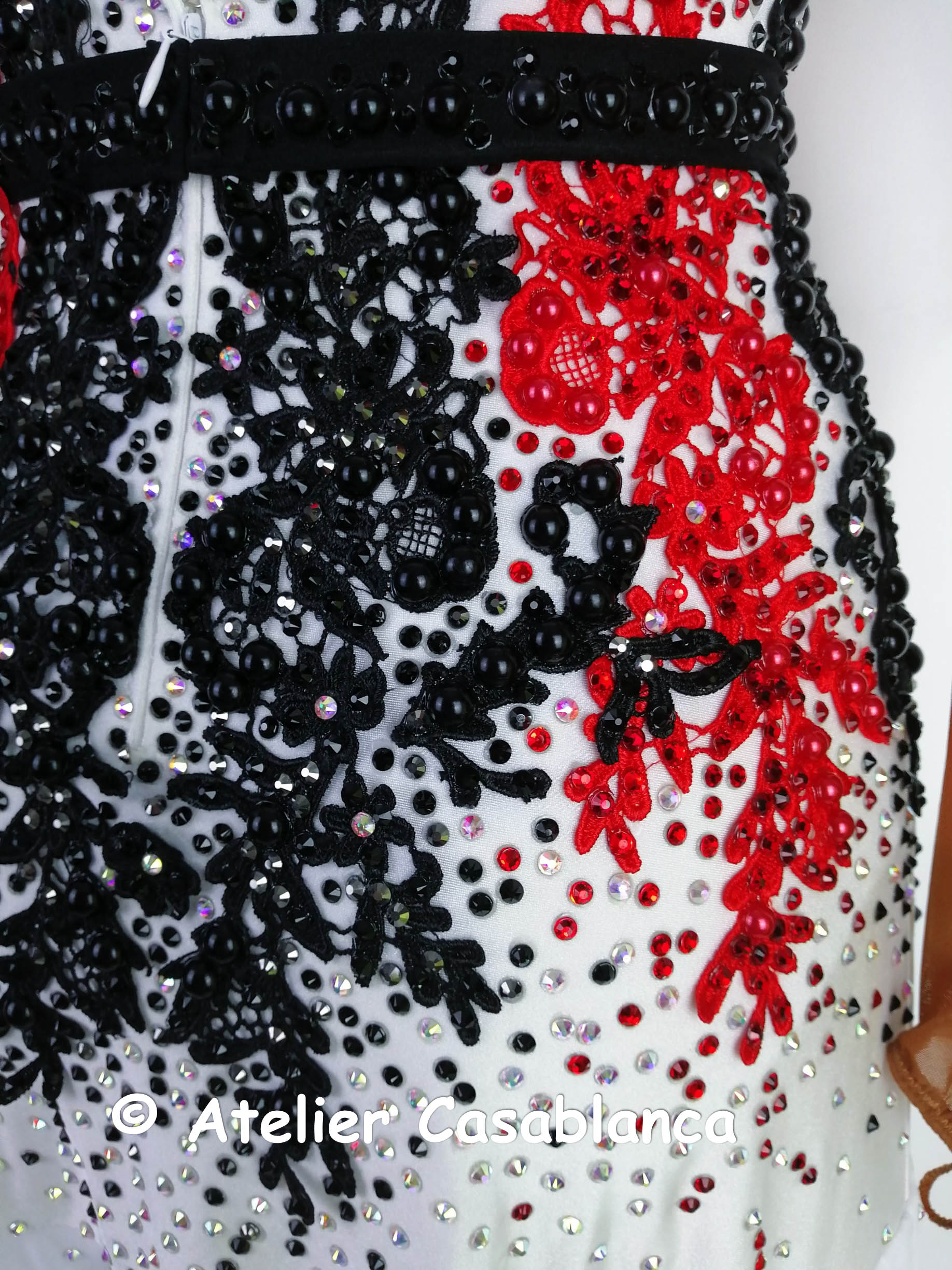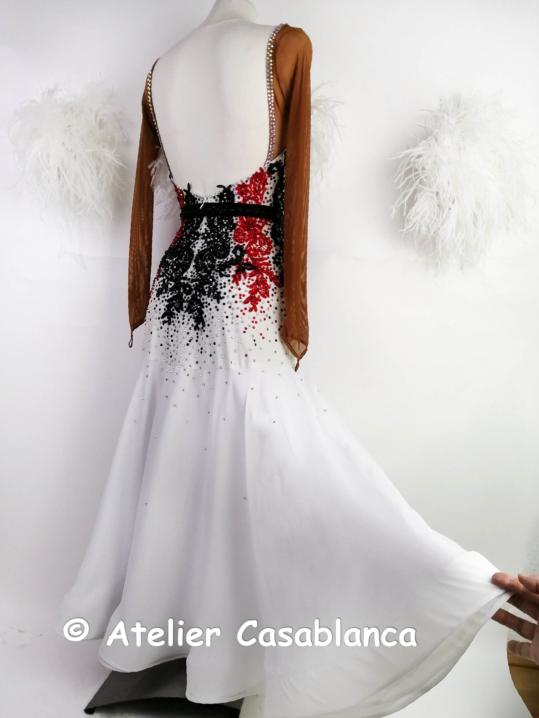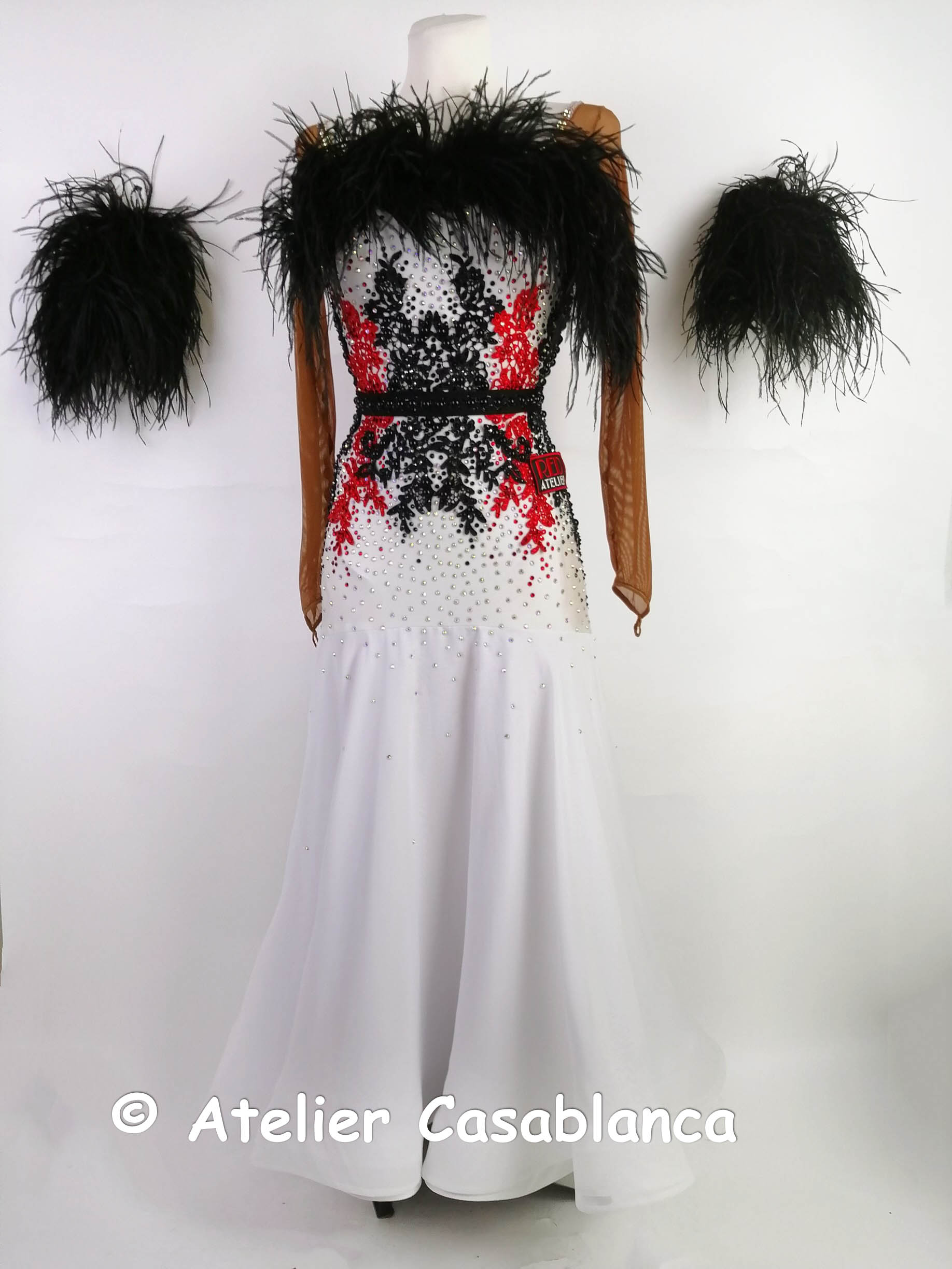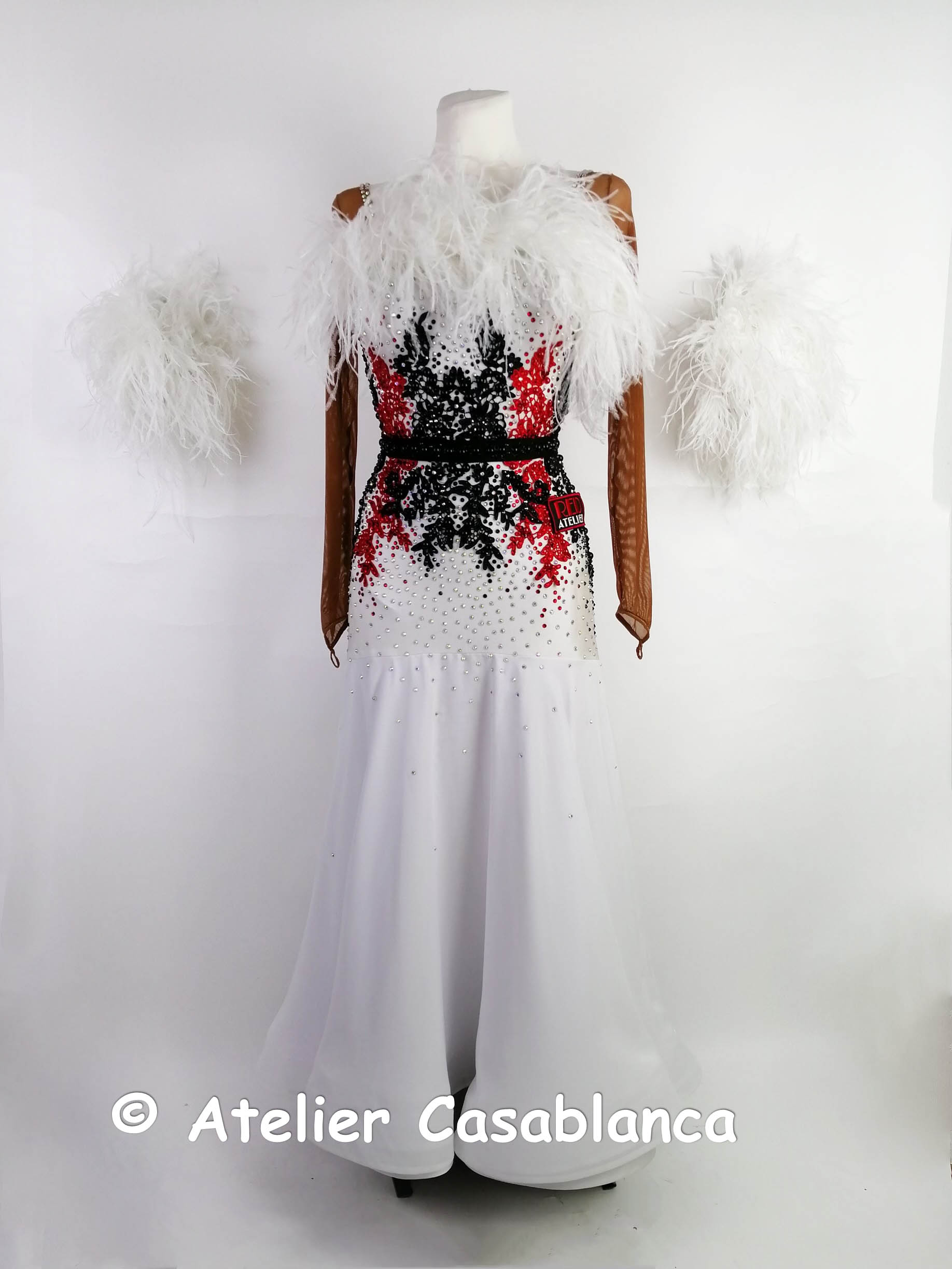 ロシアの大変素晴らしいダンスドレスブランド、「レッドアトリエ」が制作した、ボディの赤と黒のレースモチーフ使いが大変美しい、黒と白のオーストリッチの羽の飾りをボタンでチェンジすることができ長袖のスタンダードドレスです。