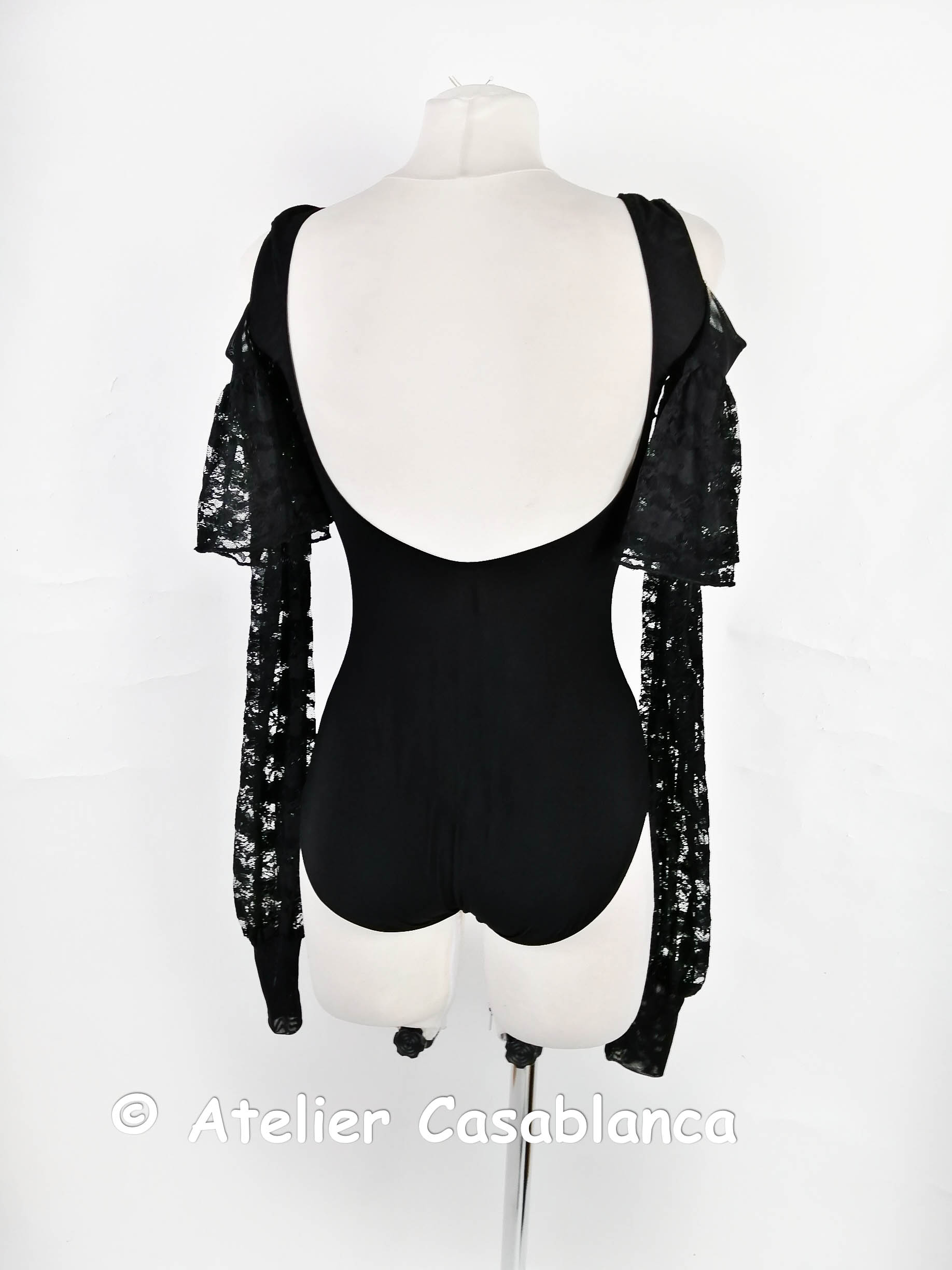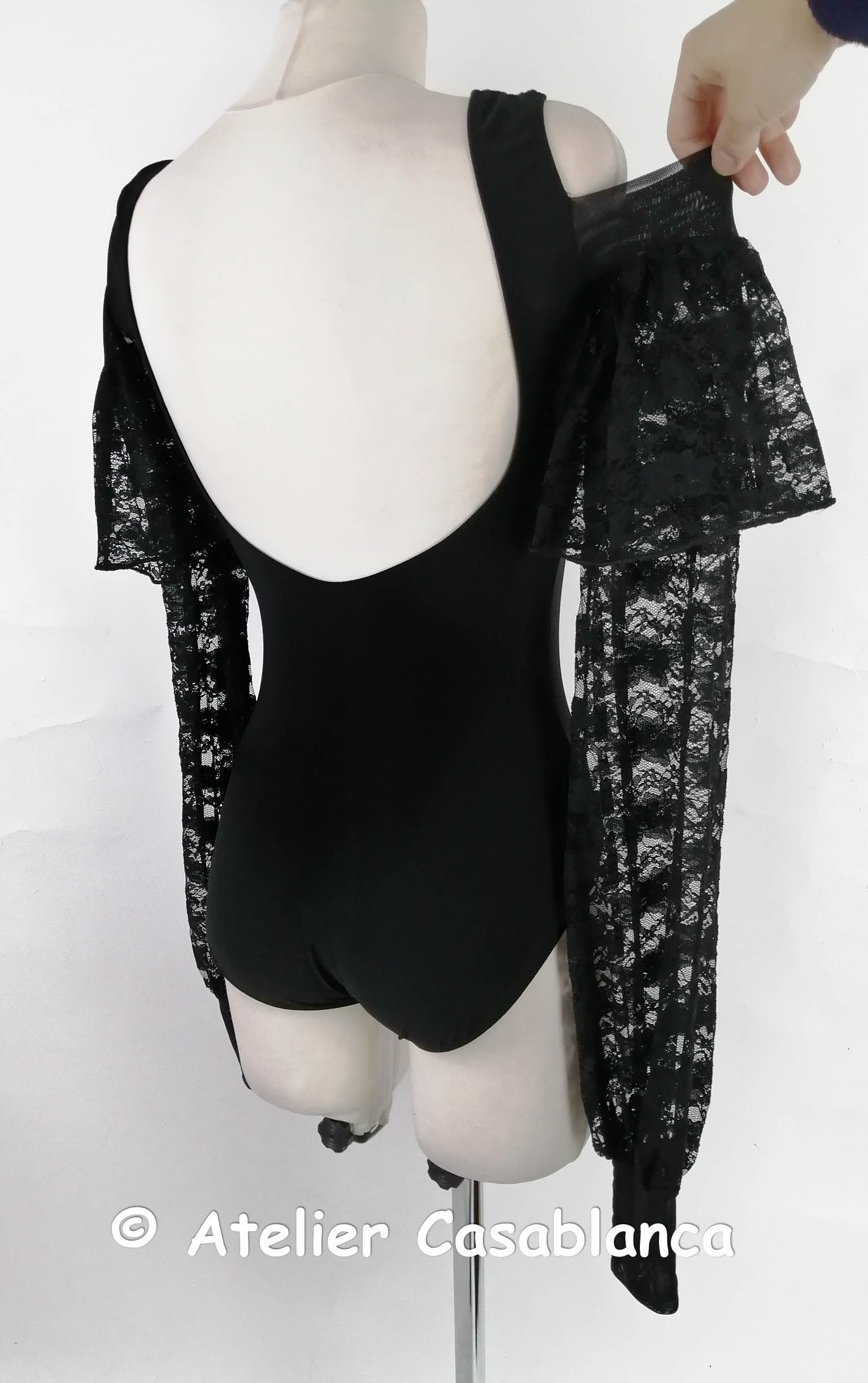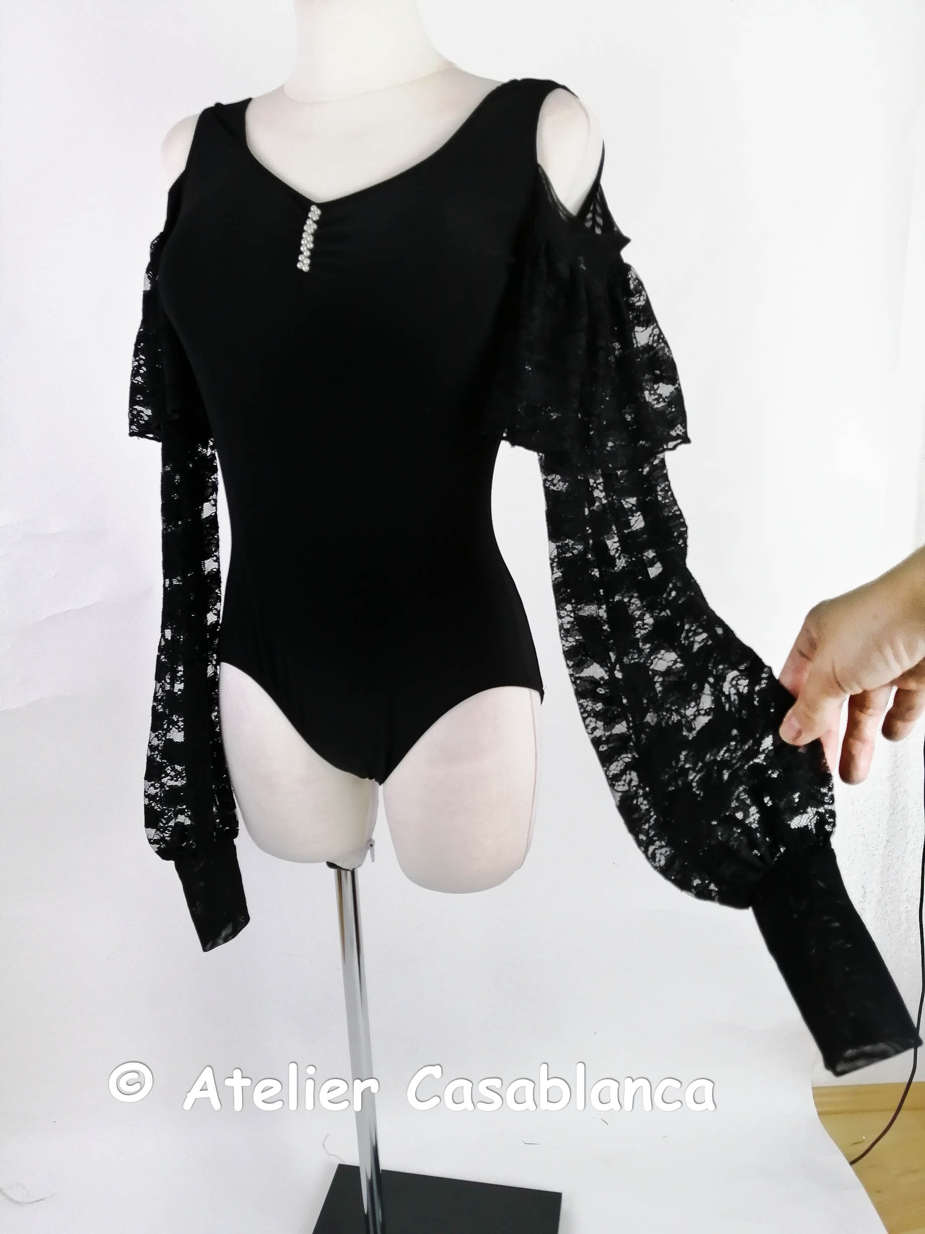 ブラックプールファイナリストのタイトルを持つ超素晴らしいウクライナのユーススタンダード選手のためにウクライナでフルオーダーで制作されたオフショルダー、袖のレースのデザインが大変美しい黒の一点物のレオタードです。