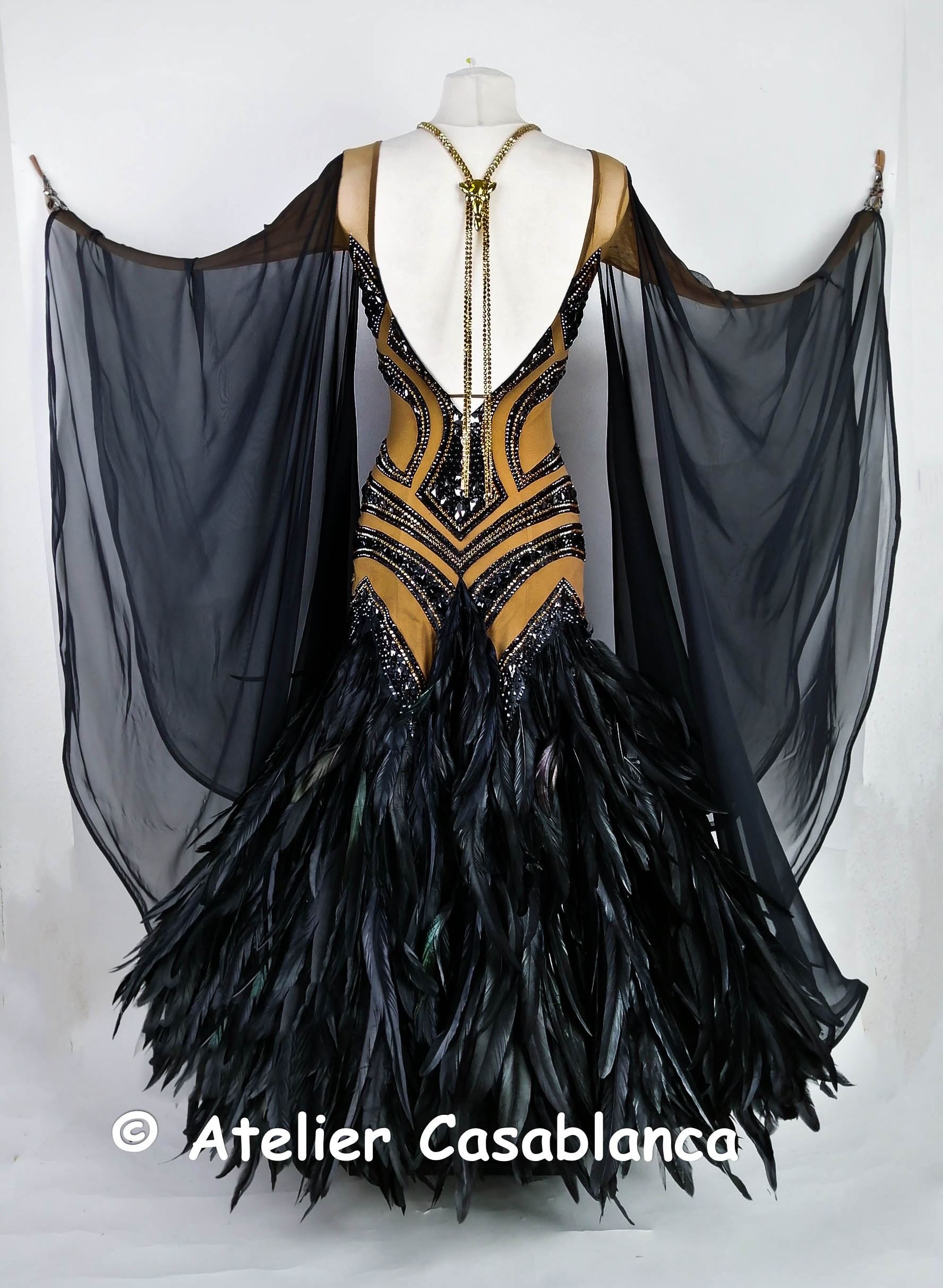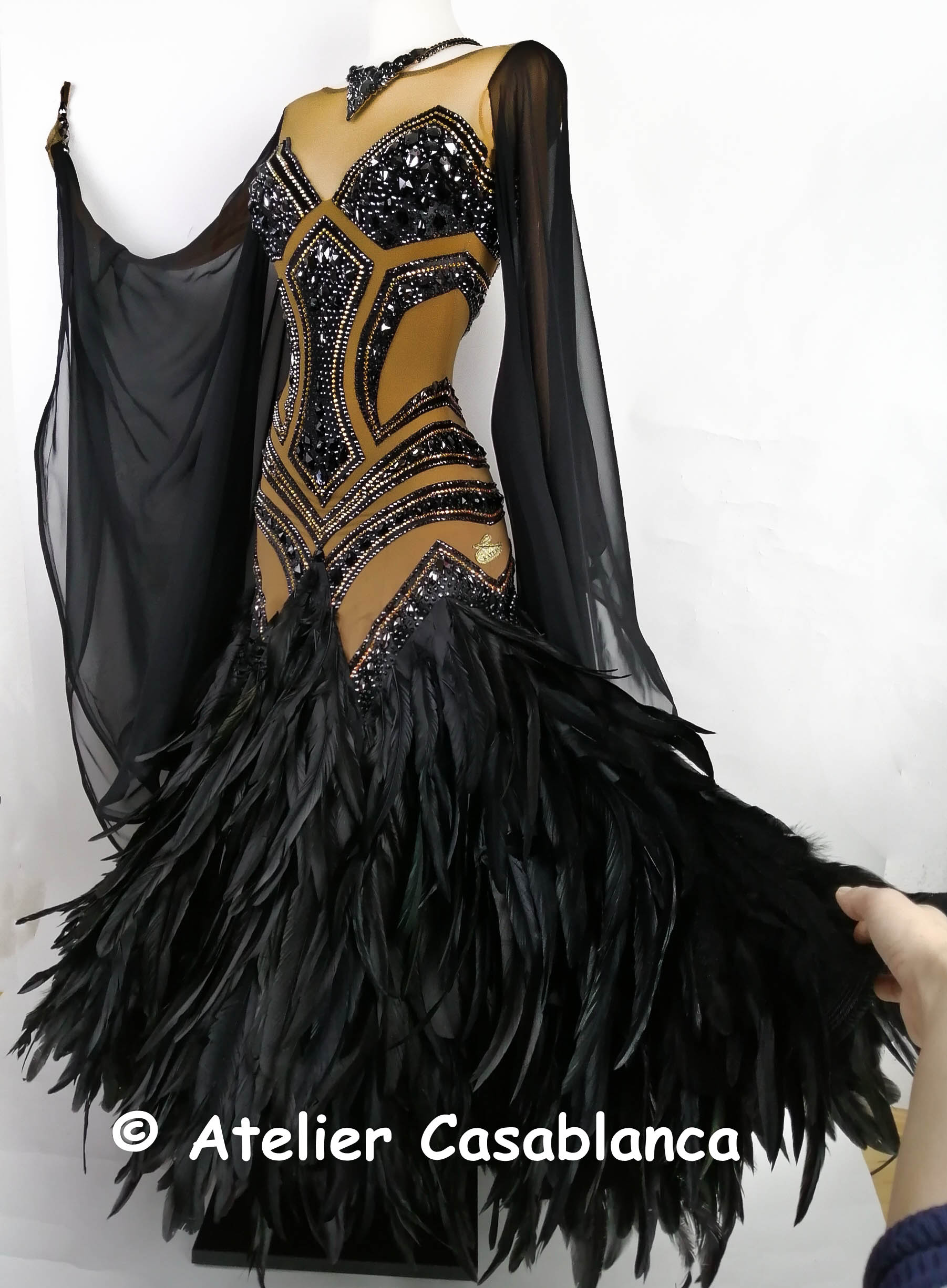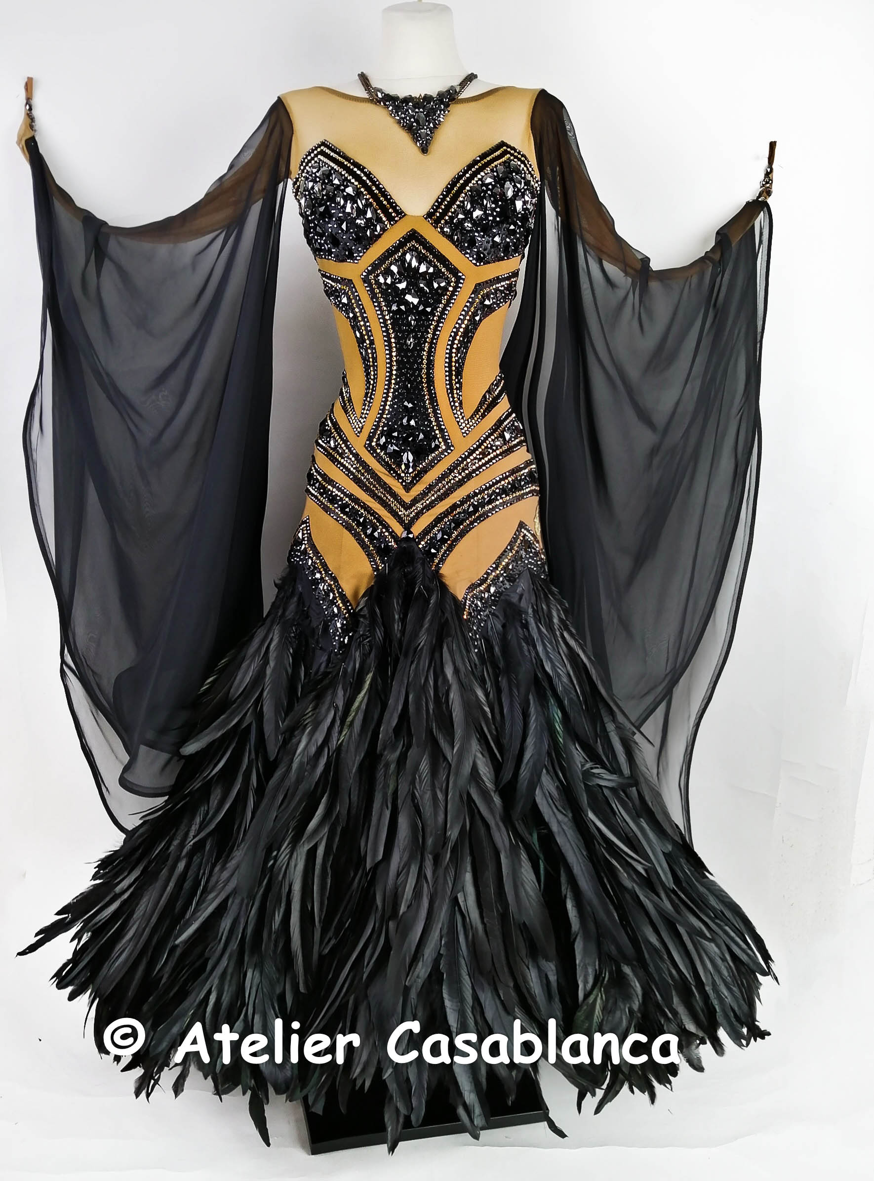 ユースブラックプールチャンピオン、世界チャンピオン、UK戦チャンピオンなどすべてのビッグタイトルを持つウクライナの超素晴らしいスタンダードダンサー、ソフィア・アルバ選手のためにウクライナのラグジュアリーダンスドレスブランドで、アトリエカサブランカでも常に大人気の「カタリーナ」が制作した、絶対に目が離せない超個性的でインパクトたっぷりの黒の羽びっしりのスタンダードドレスです。