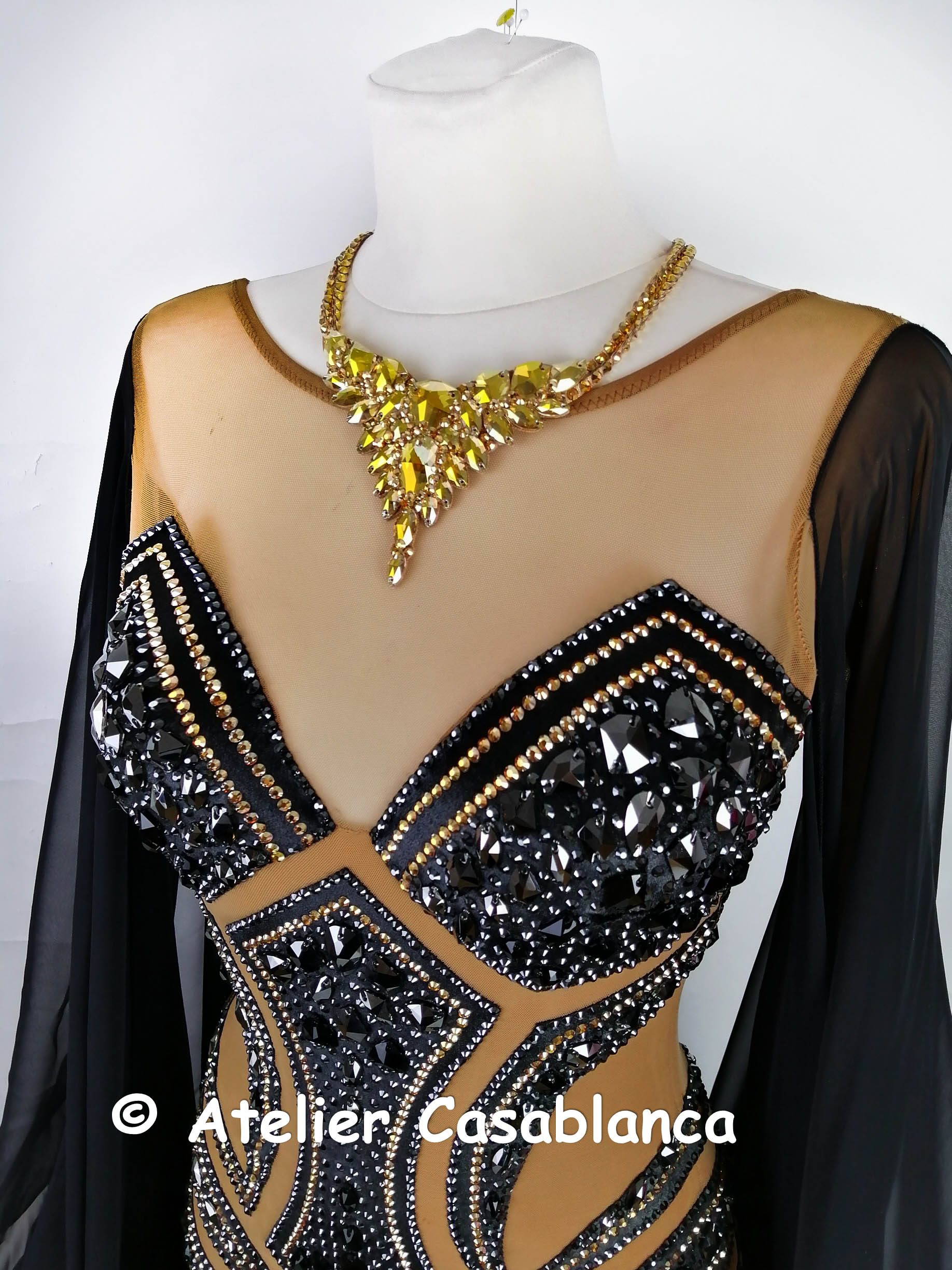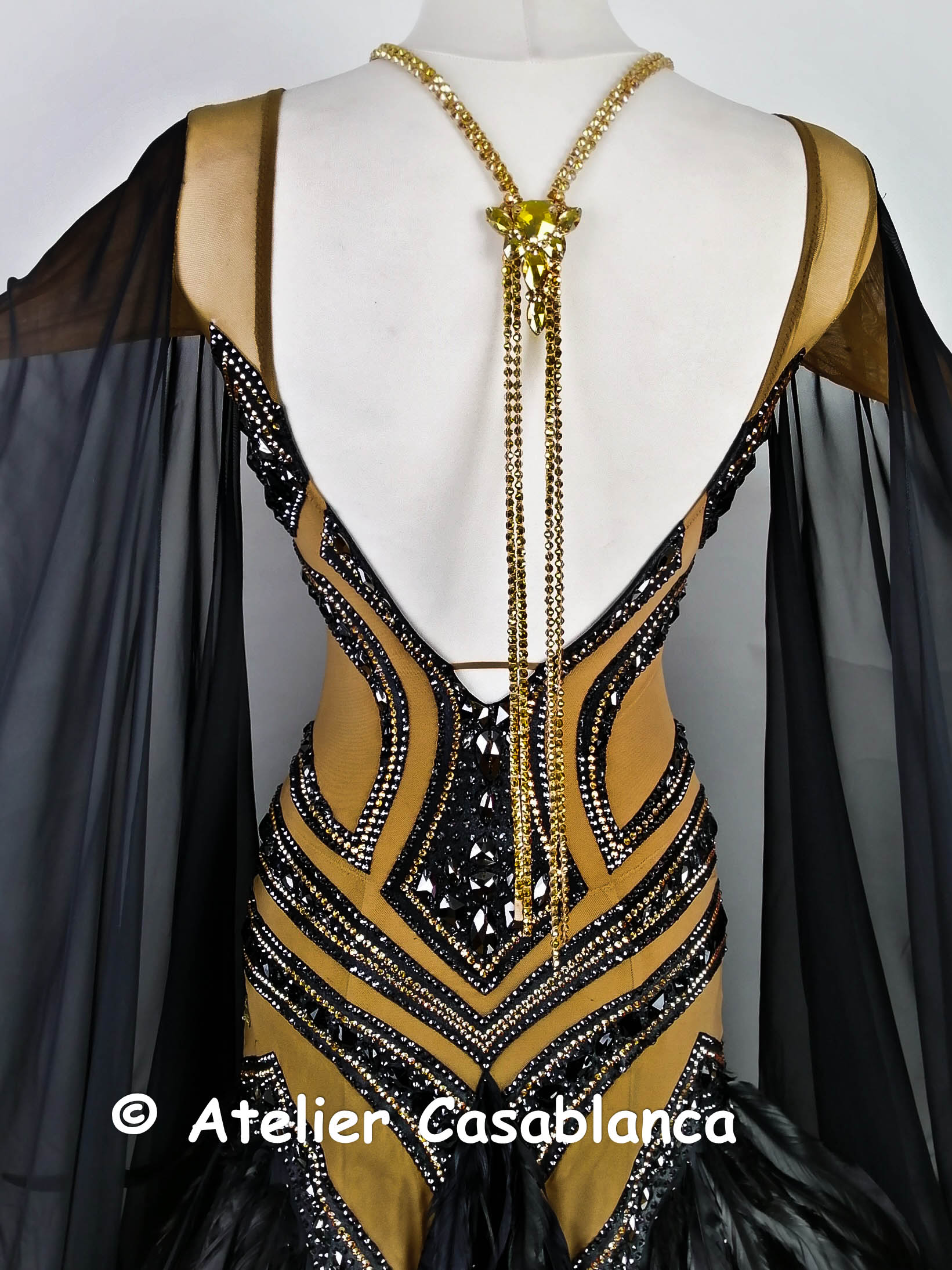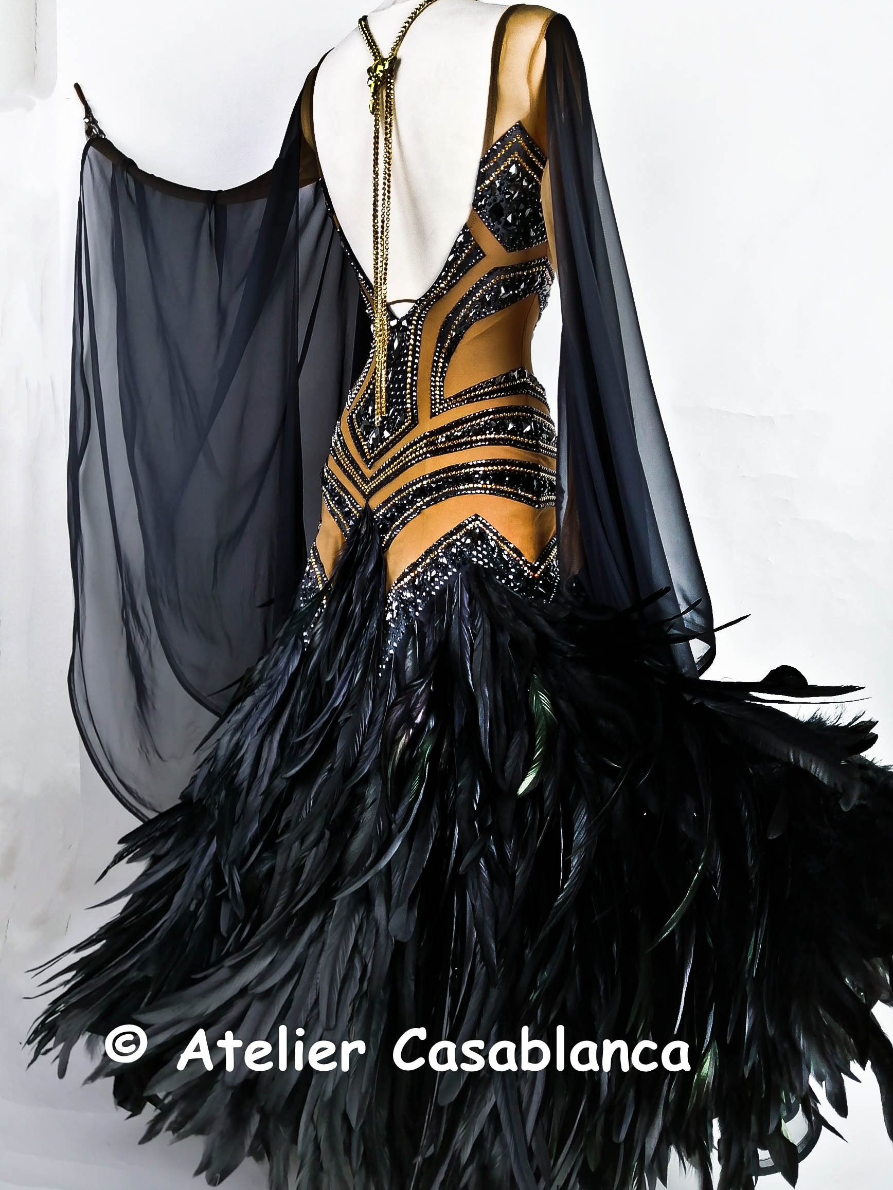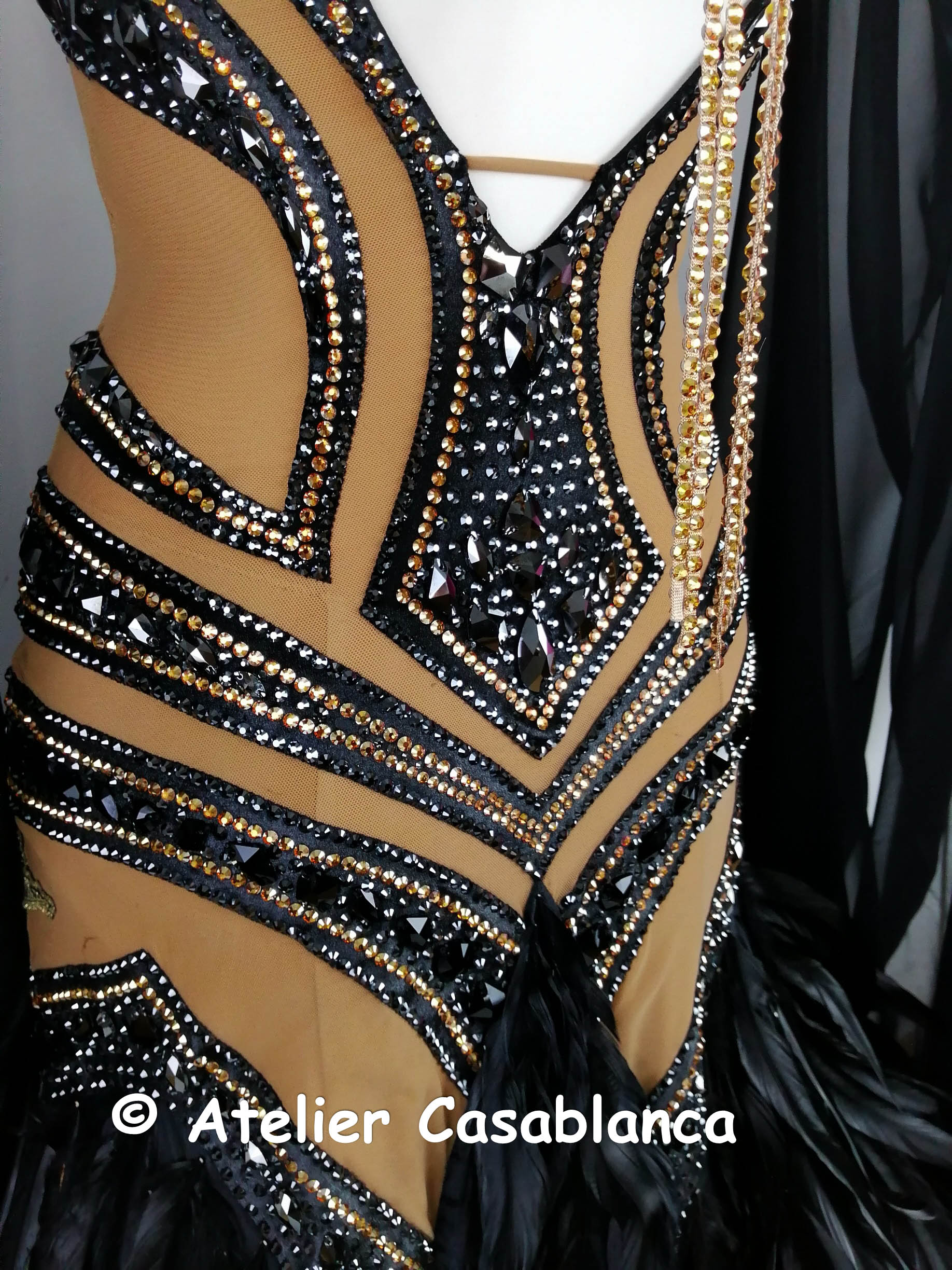 ユースブラックプールチャンピオン、世界チャンピオン、UK戦チャンピオンなどすべてのビッグタイトルを持つウクライナの超素晴らしいスタンダードダンサー、ソフィア・アルバ選手のためにウクライナのラグジュアリーダンスドレスブランドで、アトリエカサブランカでも常に大人気の「カタリーナ」が制作した、絶対に目が離せない超個性的でインパクトたっぷりの黒の羽びっしりのスタンダードドレスです。