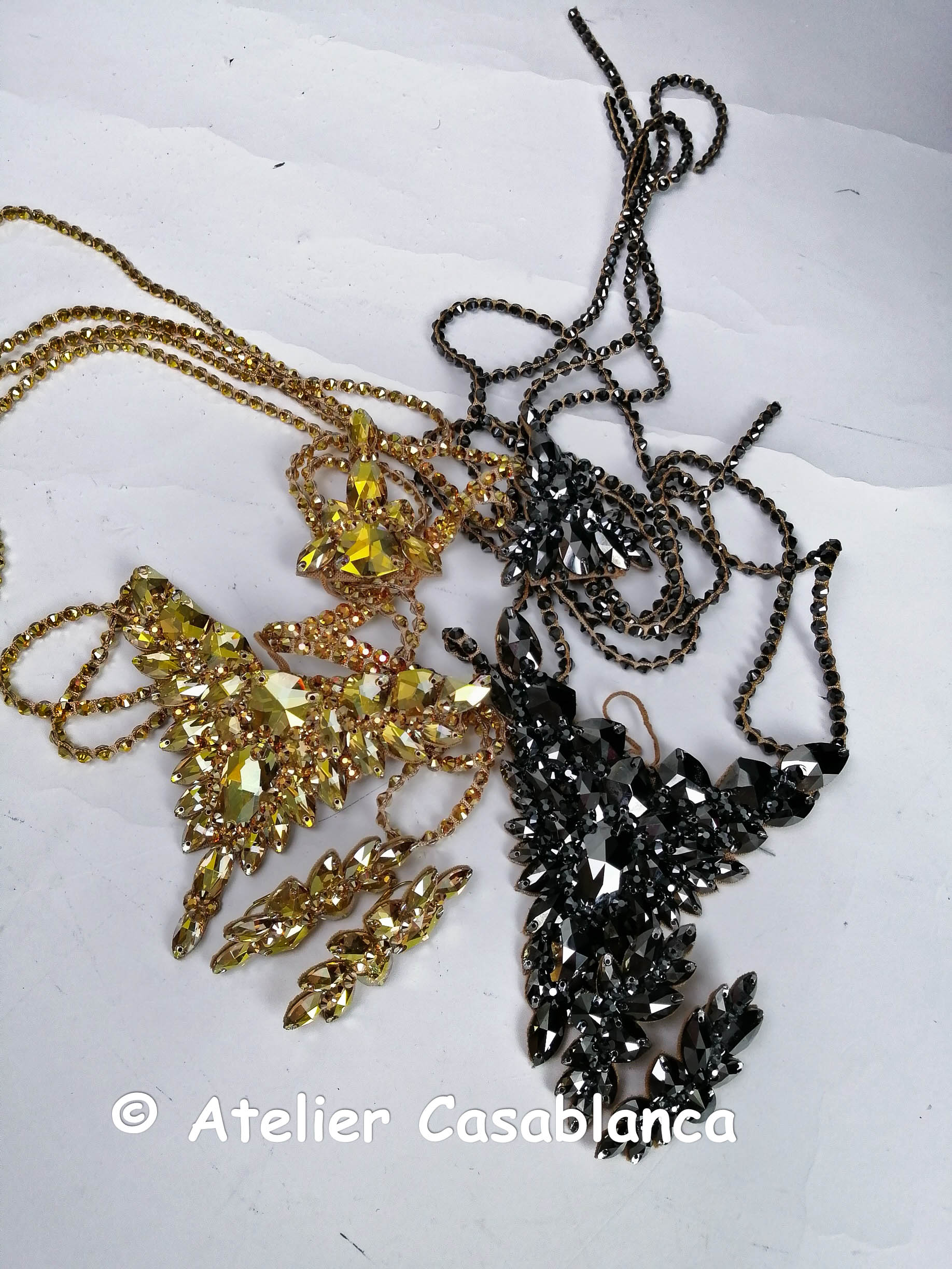 黒とイエローゴールドの大変美しいネックレスが付属しており、垂れ下がるチェーンが大変華やかで豪華です。ネックレスはネックラインにループがついていてドレスに固定できるようになっています。