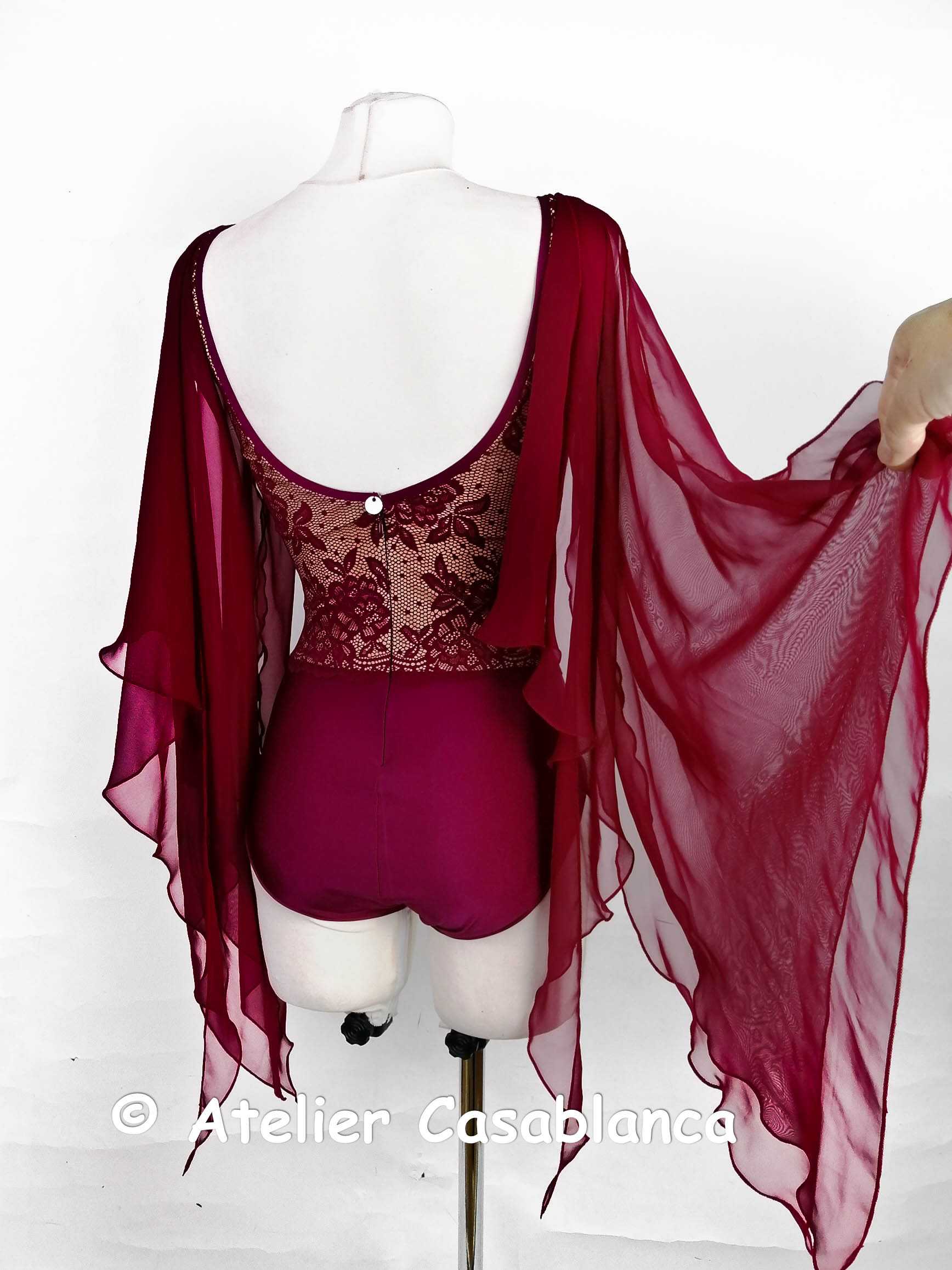 ベージュのストレッチライクラ素材に英国製の美しいチェリーレッド色のストレッチレースを組み合わせており、背中にファスナーがあり、デコルテも背中もあまり開きすぎないエレガントで美しいライン。前はきれいなV字、後ろは美しいラウンドのラインで、ホールドしたラインが大変美しく見えるウェアです。