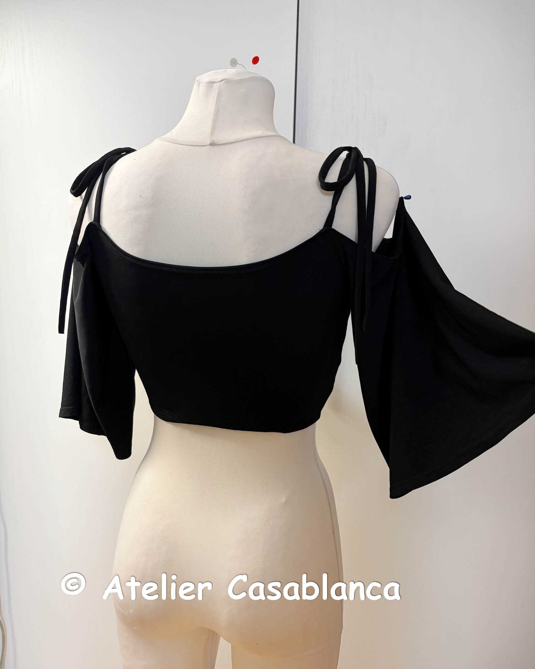 肩ひもをリボンで結ぶデザインで、オフショルダーなのでホールドしたラインがとてもきれいに見えるデザイン。流行のショート丈なので、ハイウェストのパンツと合わせて足長でウェストを細く見せる視覚効果のある大変カッコイイデザインです。