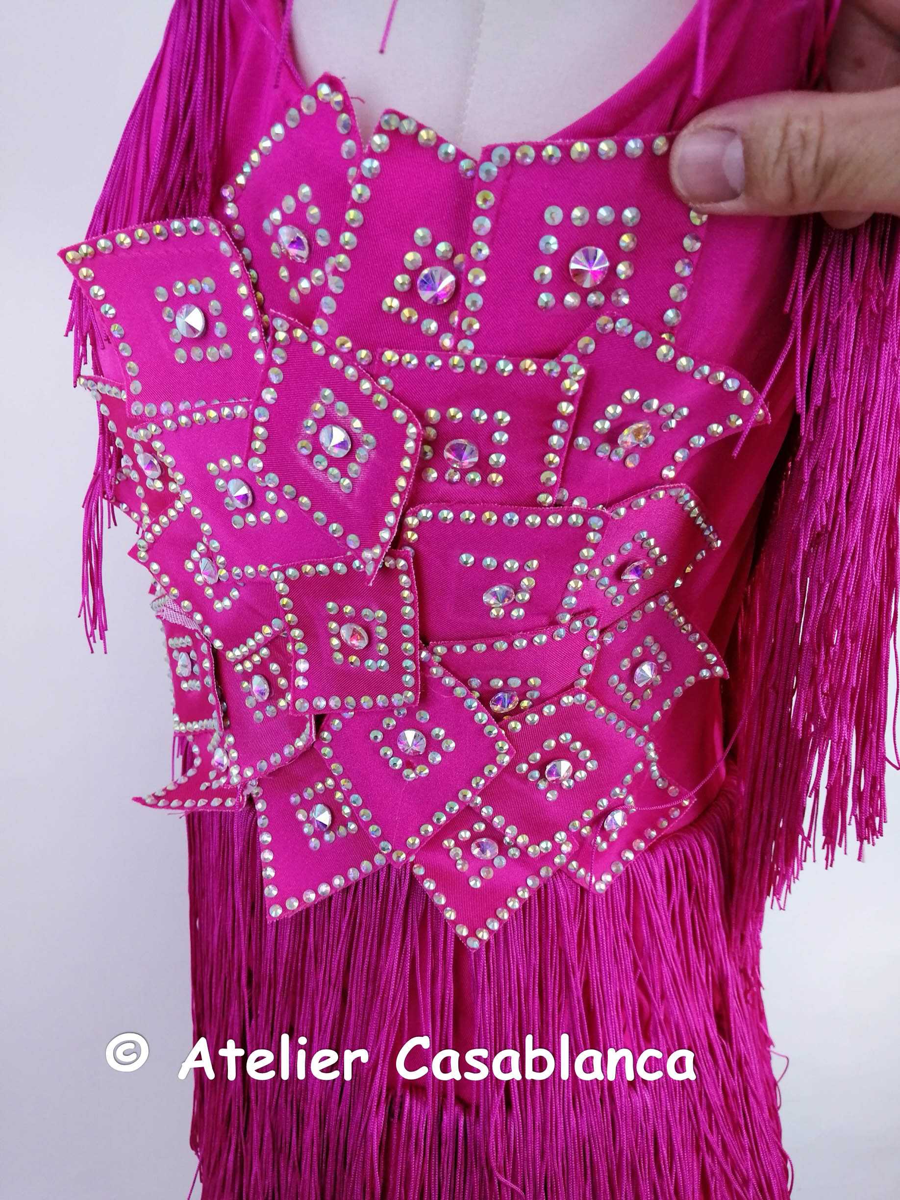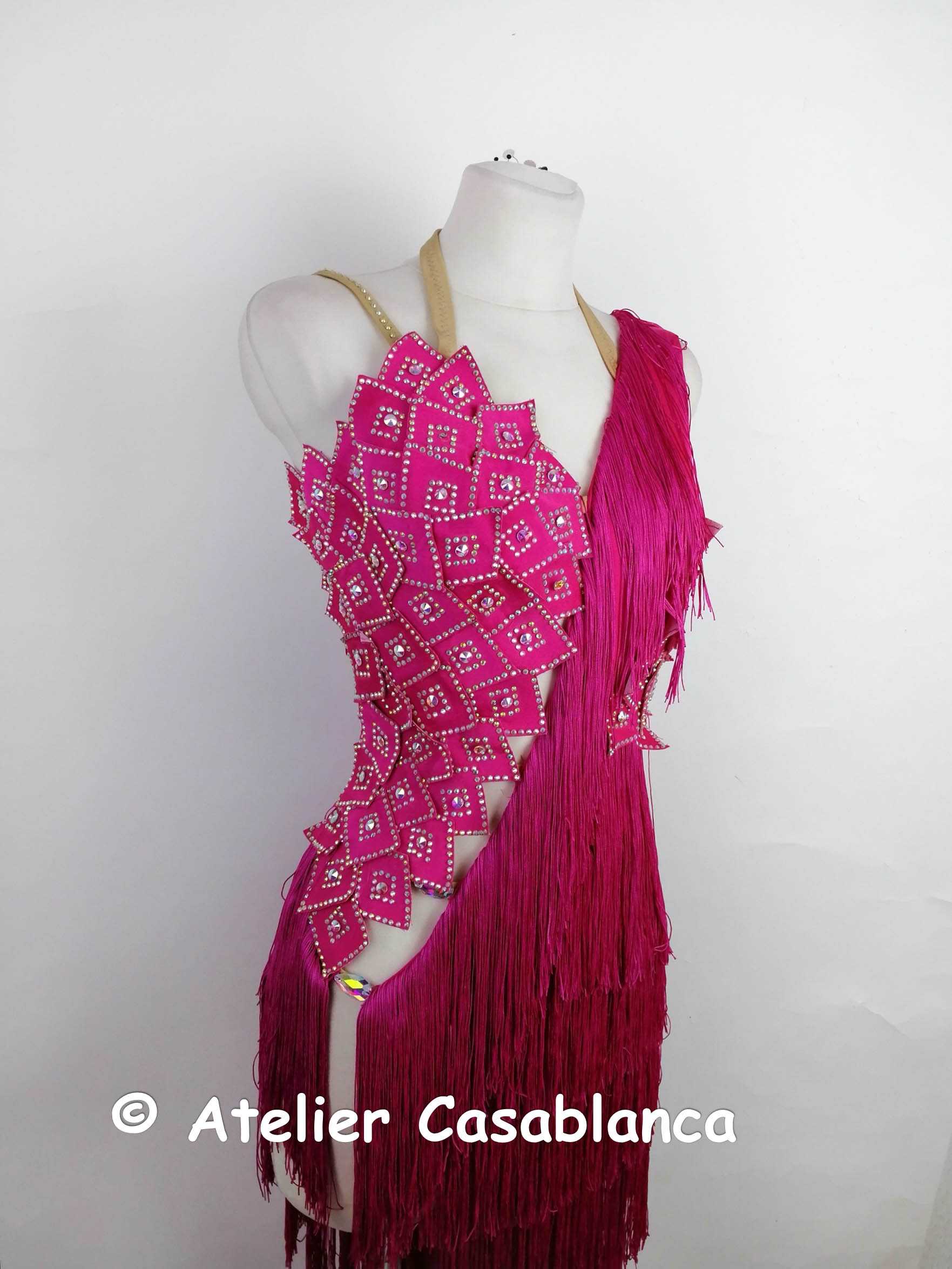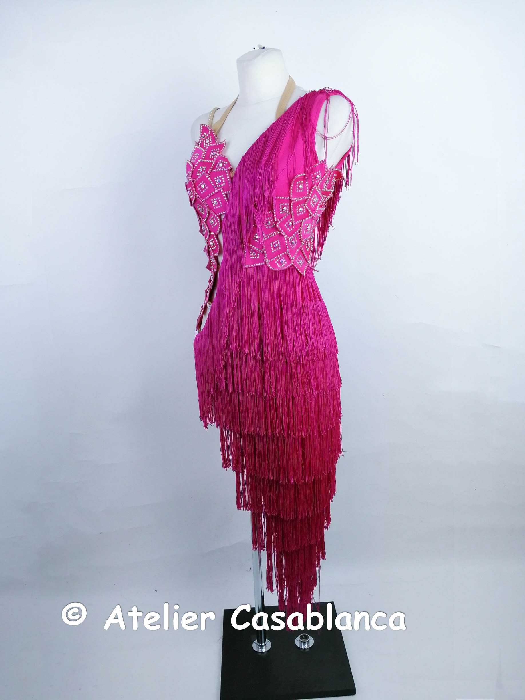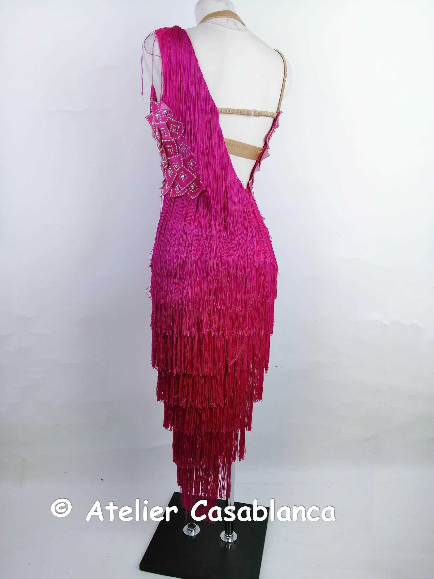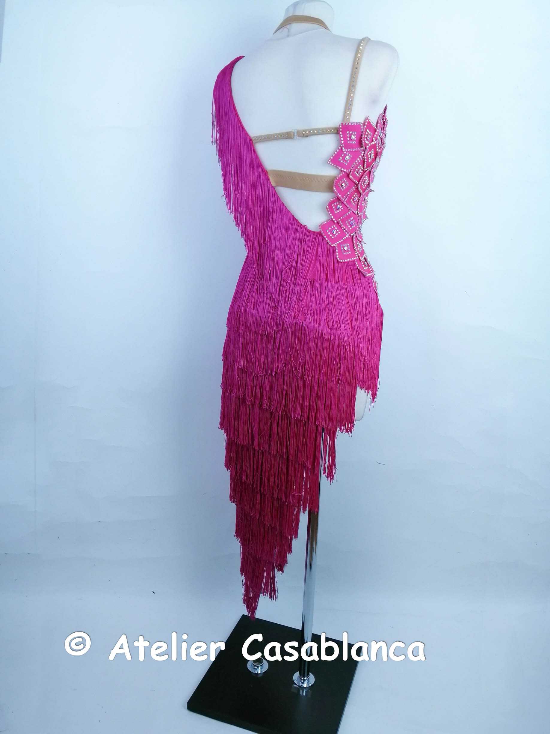 スカートの段になったフリンジが大変良く踊るアシンメトリーなフューシャピンクのラテンドレスです。ドイツのシニア選手の所有で1回着用。