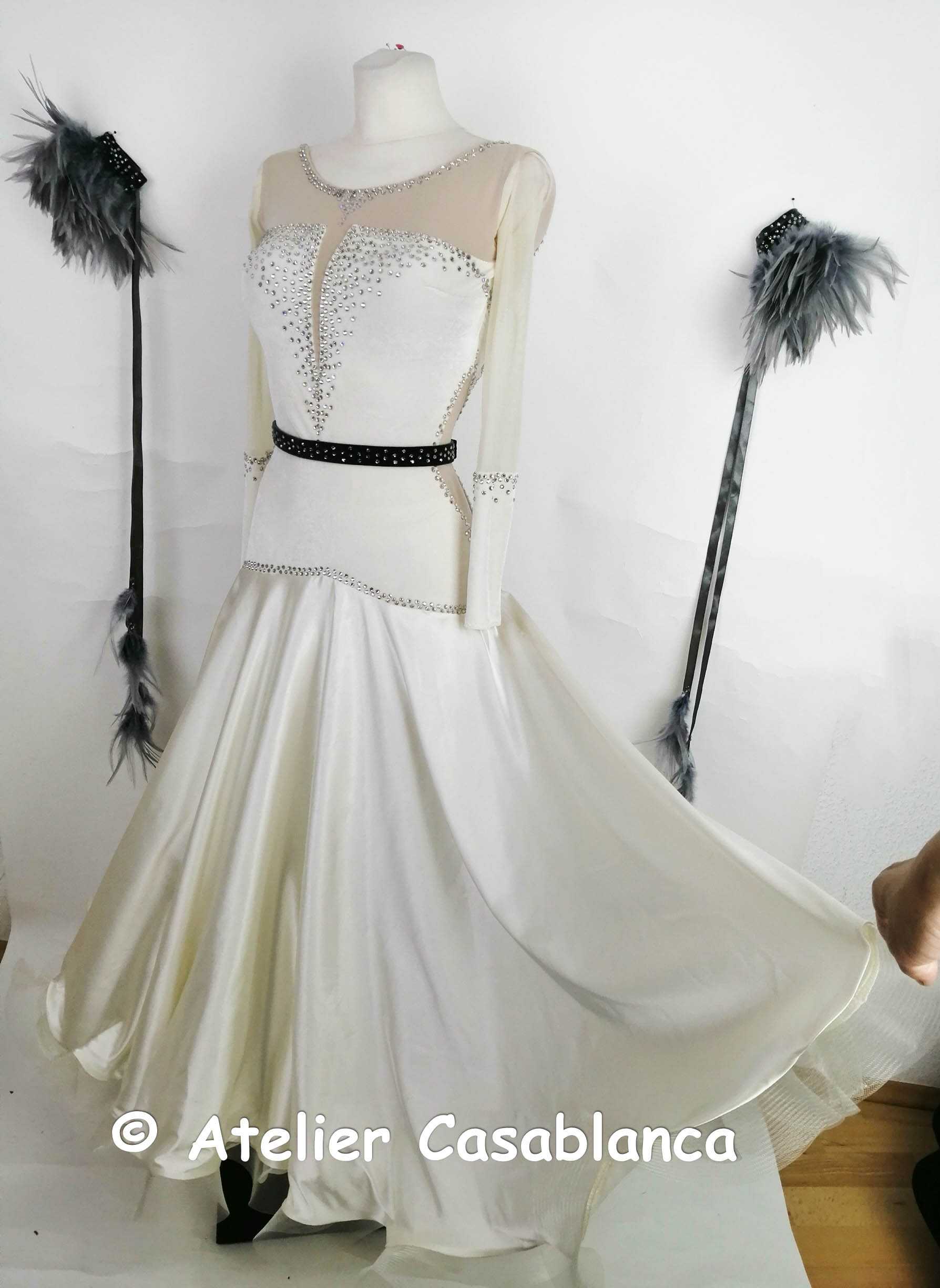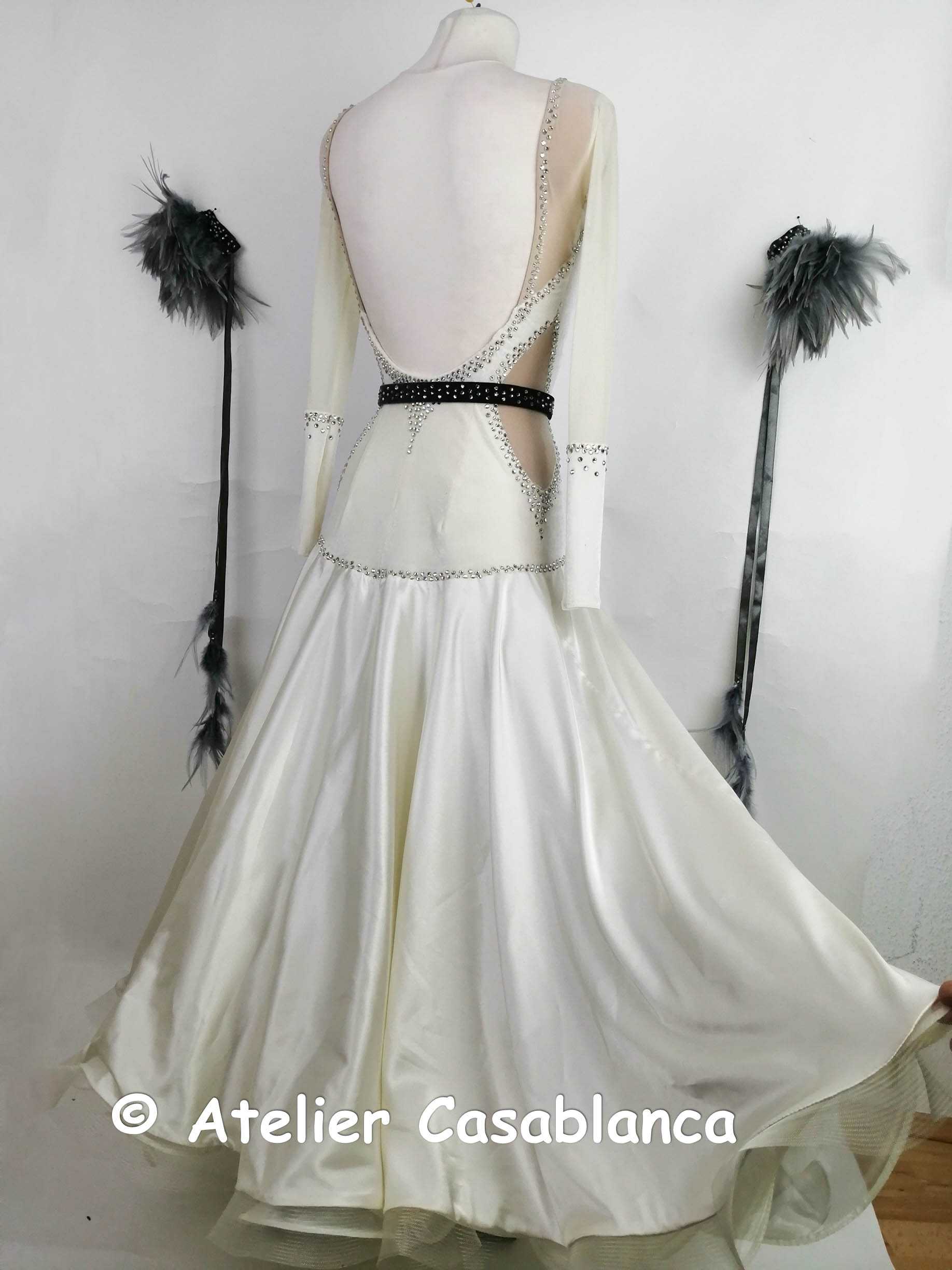 一見シンプルながら、ベルベットとサテンの素材感やラインの美しさが超素晴らしいアイボリーの長袖のスタンダードドレスです。リトアニアで制作されました。