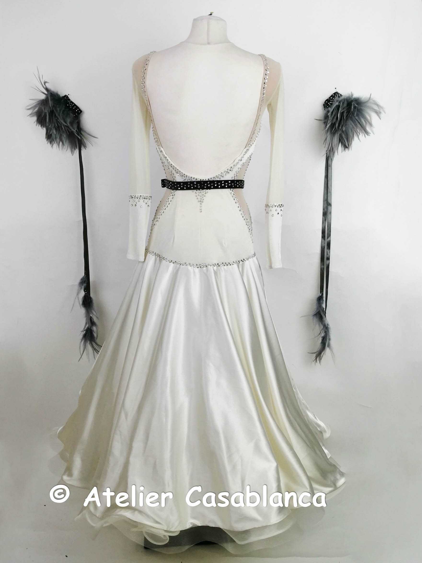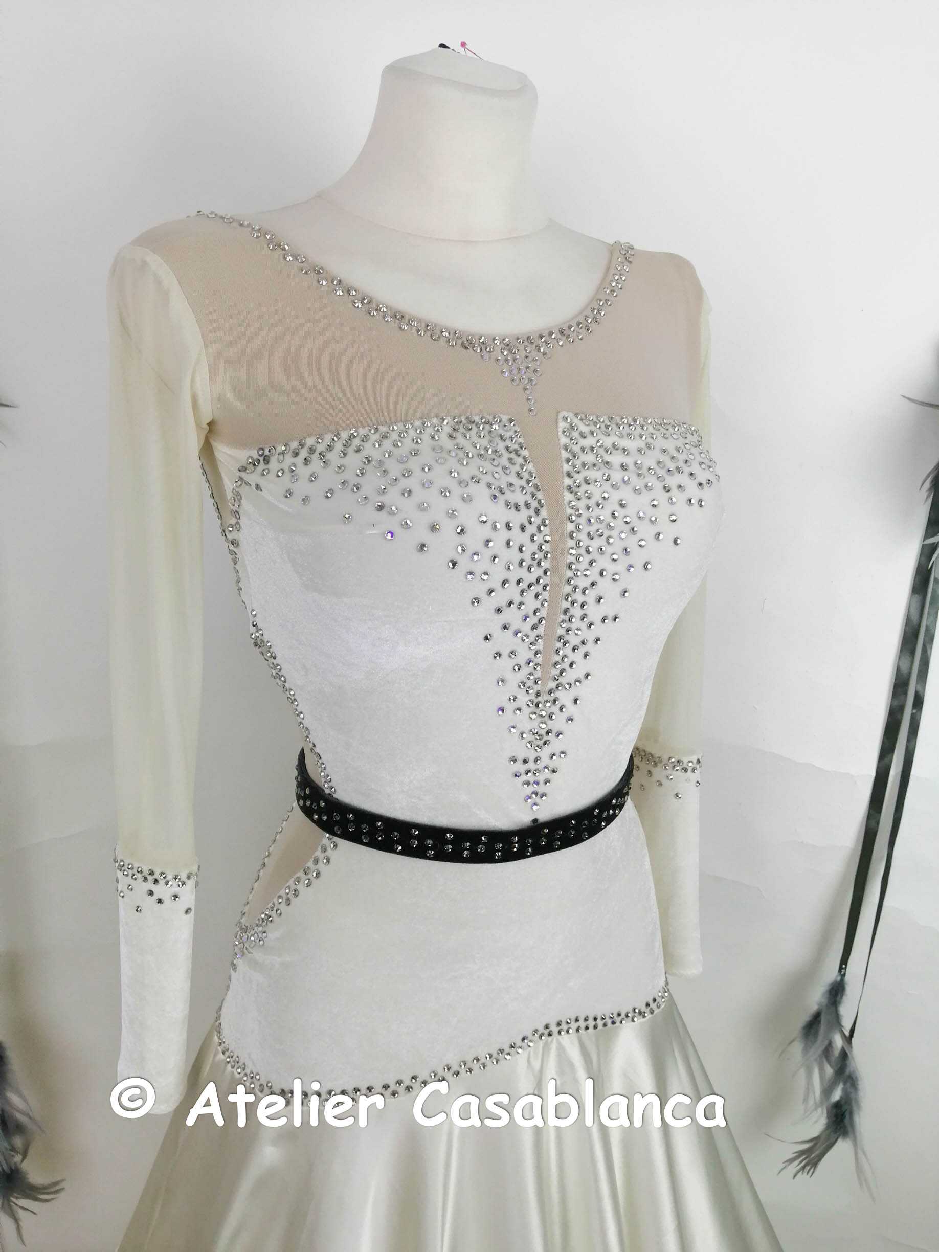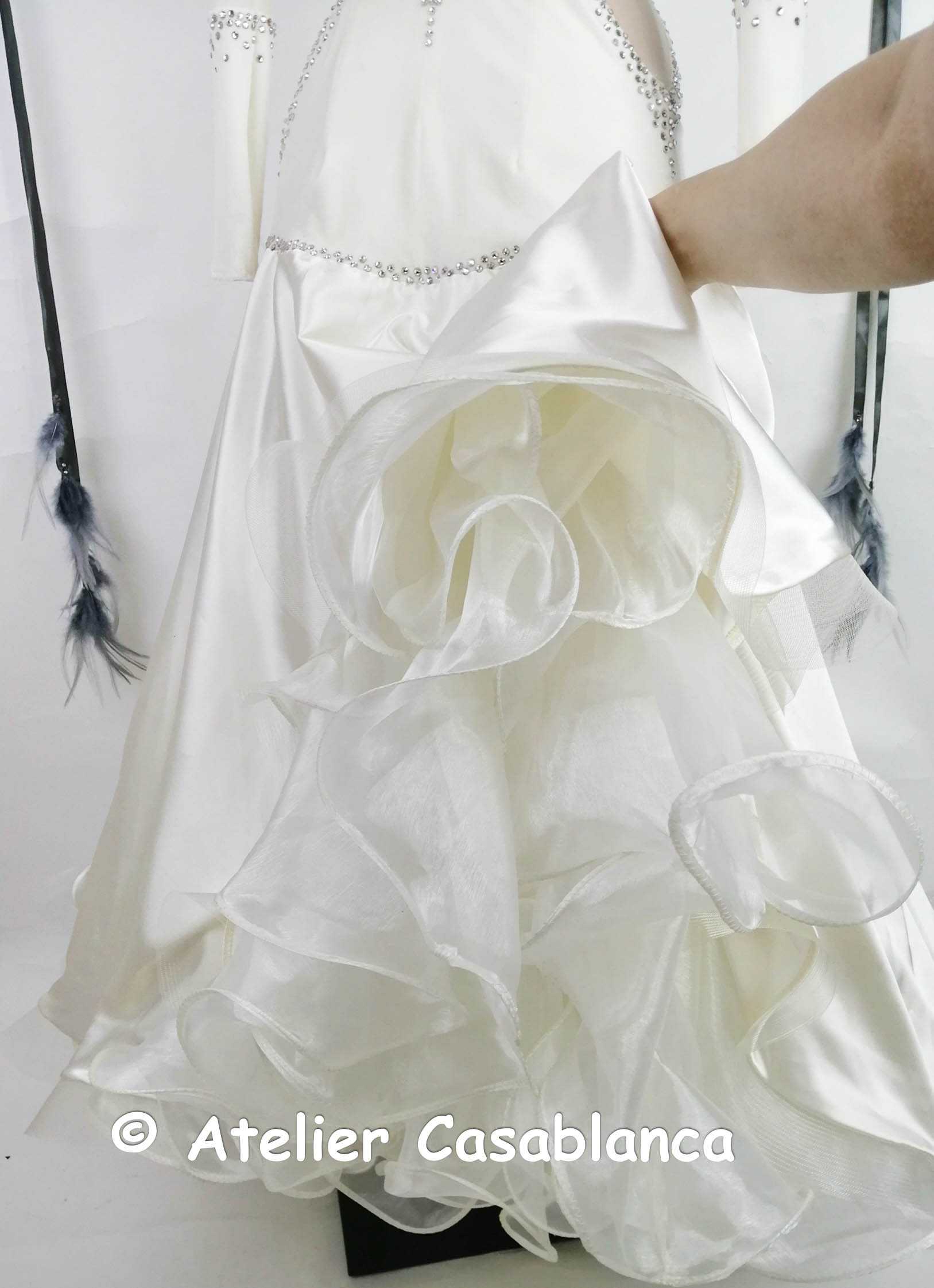 スカートはダブルになったボリュームたっぷりのラインが超美しいオーガンジーパニエの上に光沢が非常に美しいクリスアンクローバーのアイボリーのストレッチサテン素材の全円のスカートを組み合わせており、スカートに非常にインパクトがあってとにかくとても美しく踊る、一見シンプルだからこそ絶対に目の離せない超美しいドレスです。