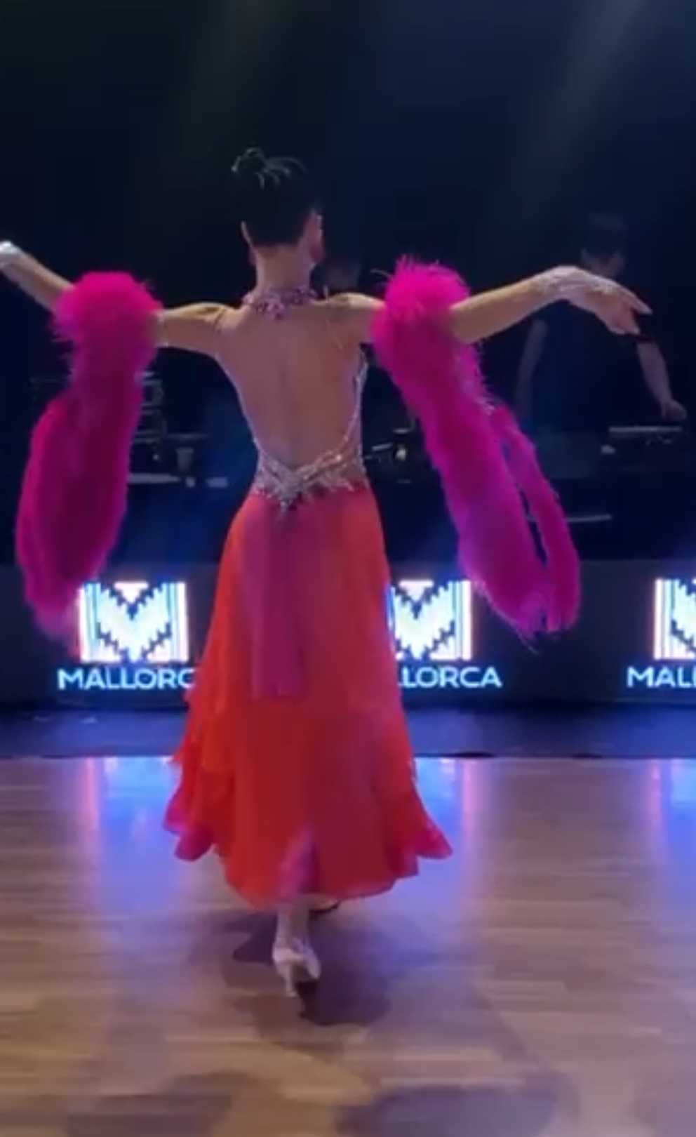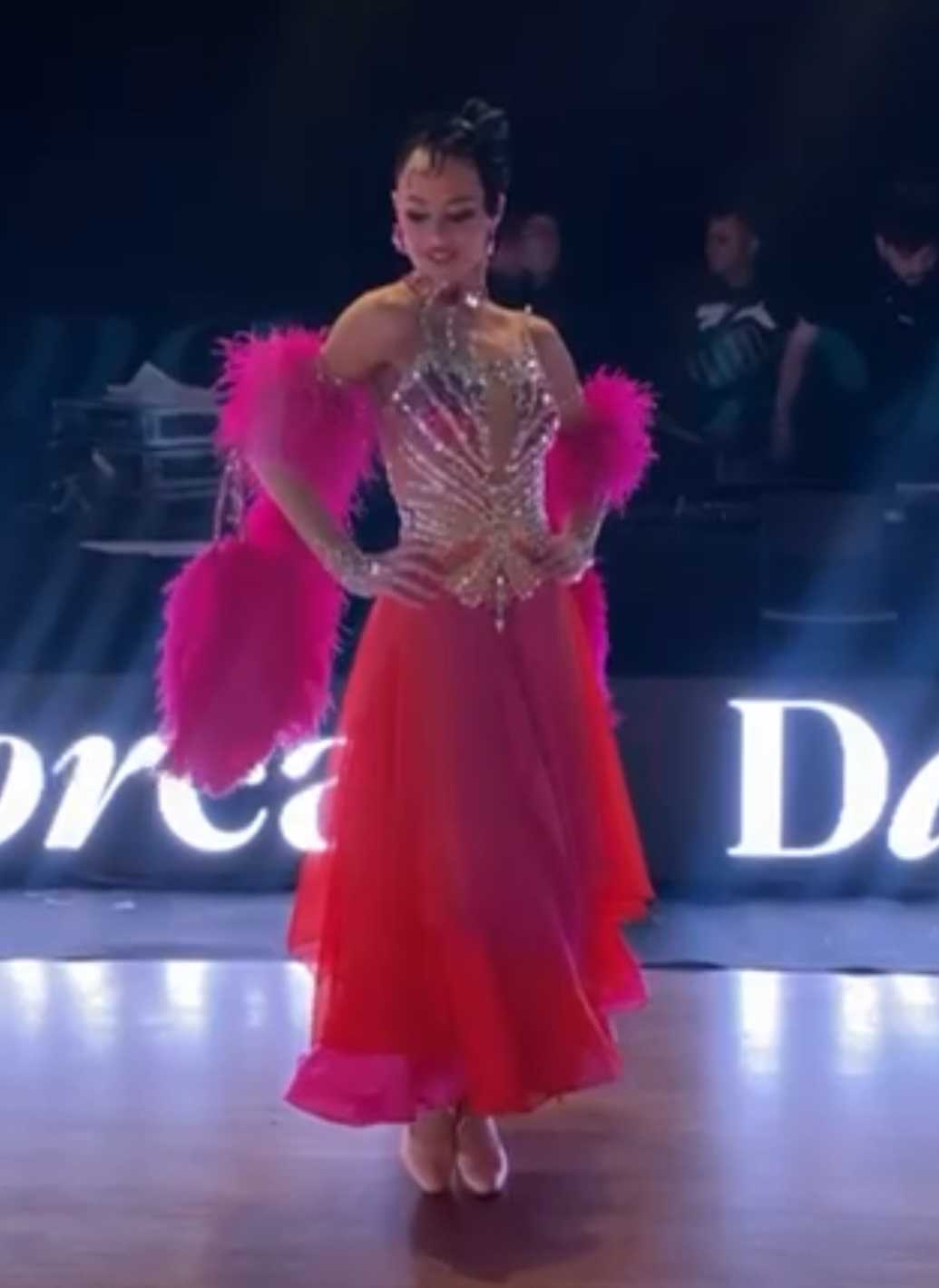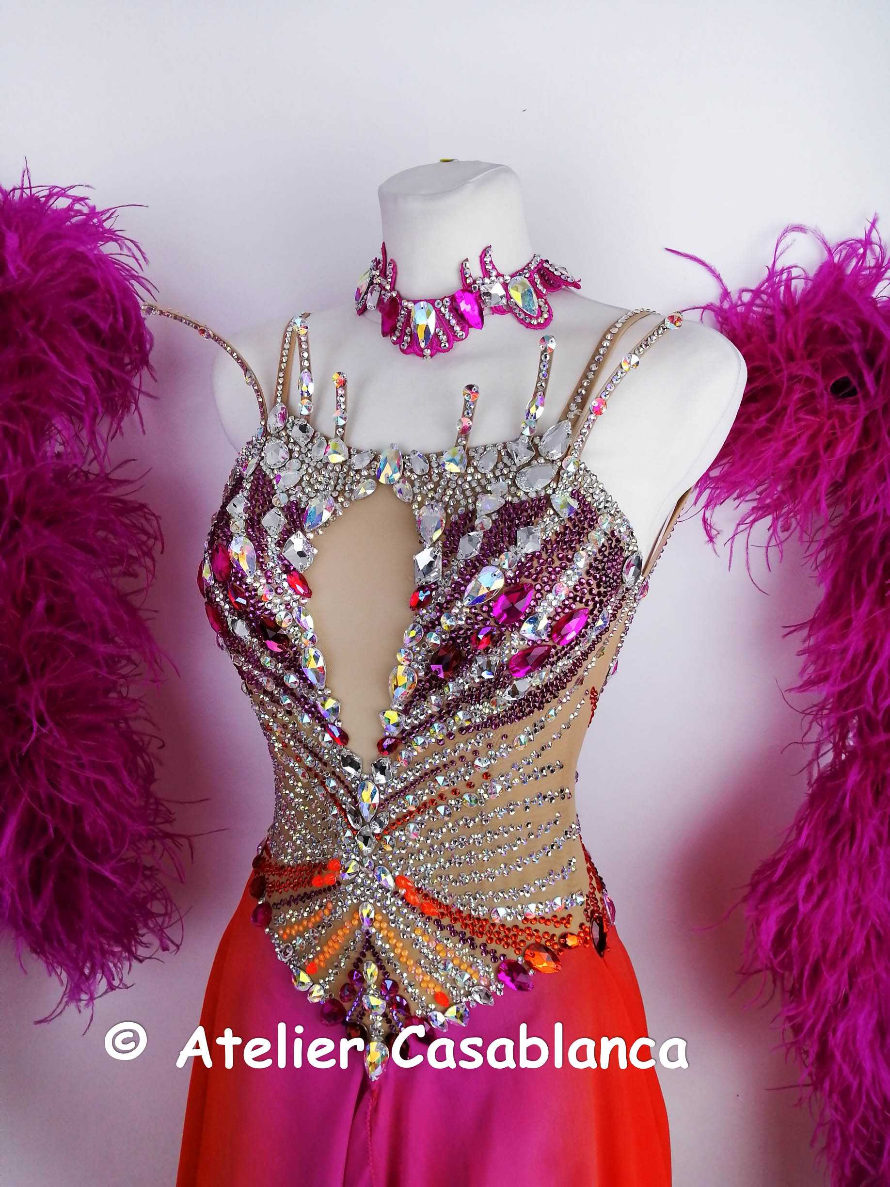 ロシアの超素晴らしいダンスドレスブランドで、管理人自身も多くのドレスを着用している「ゲームデザイン」がラトビアのチャンピオンで、2025年のプロフェッショナル世界選手権(東京開催)にて銀メダルを受賞したアナスタシア・メシュコワ選手のために制作した、スカートのグラデーションが超美しい石びっしりのオレンジ~ピンクのスタンダードドレスです。