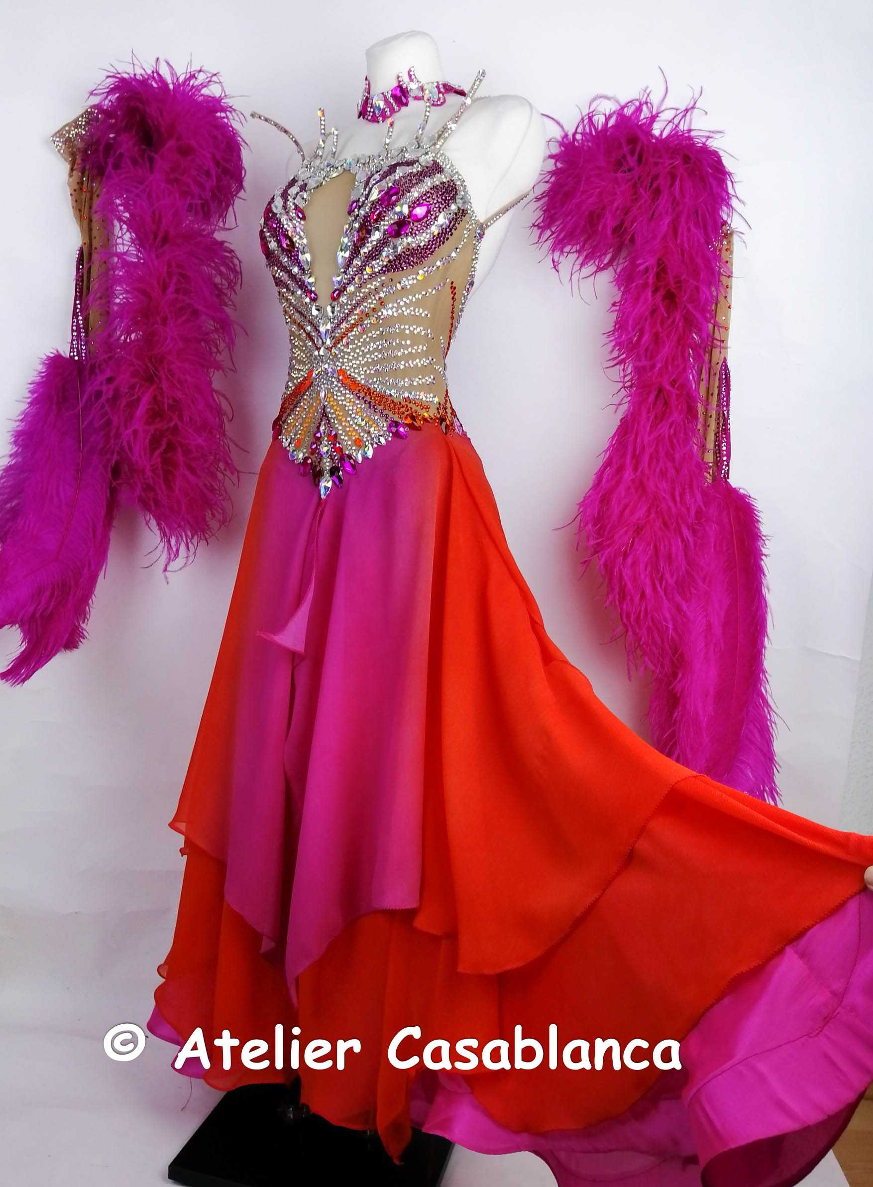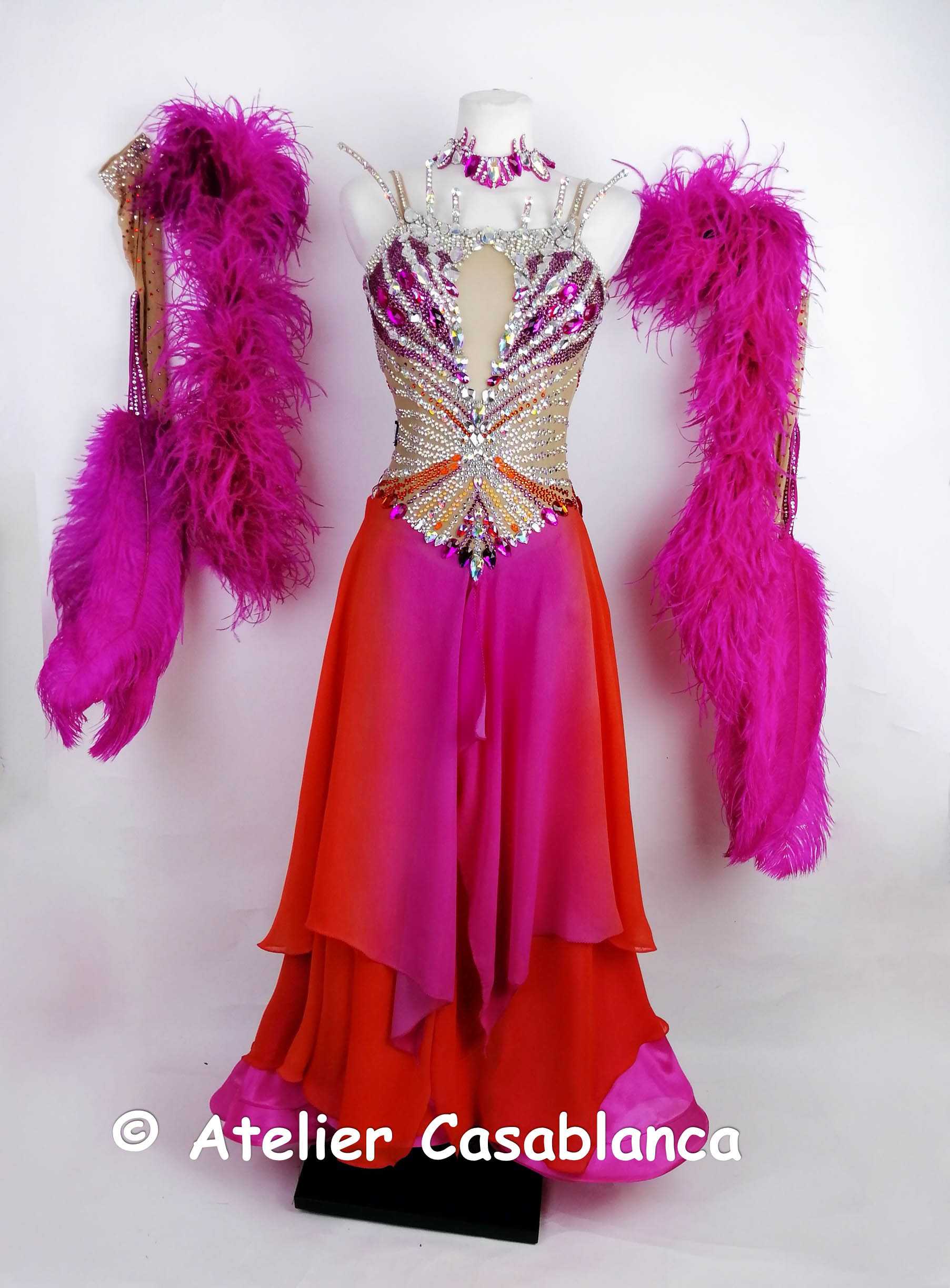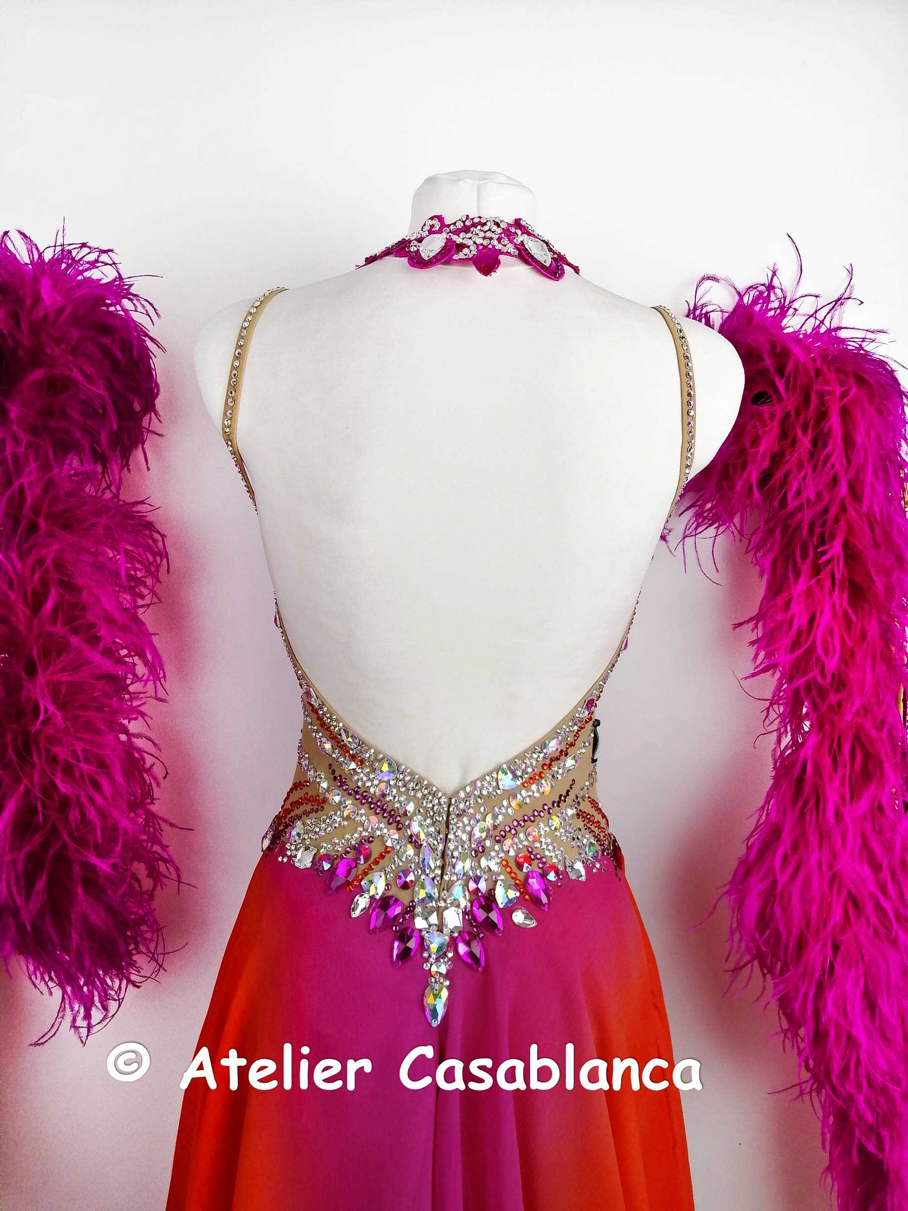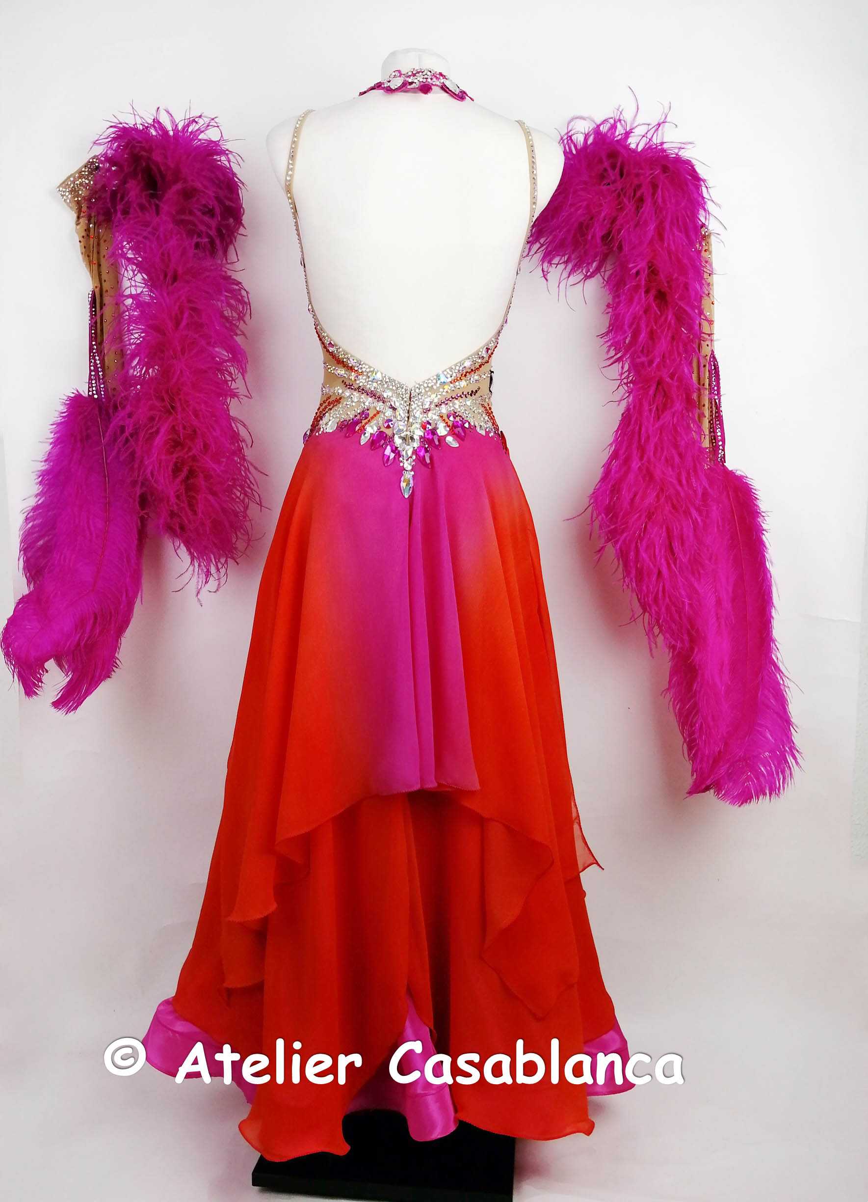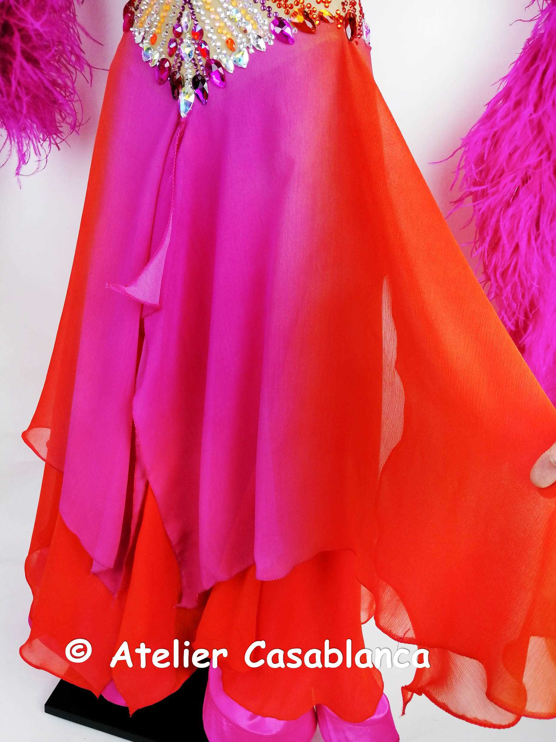 スカートはピンクのパールシフォンのアンダースカートの上にオレンジ~ピンクのグラデーションになった大変美しいジョーゼットを重ねていて、とにかく軽くてびっくりするほど動きやすいドレスです。切り替えのラインが絶妙で、ヒップラインやおなか周りをきれいにカバーして、大変美しく軽やかに踊ります。