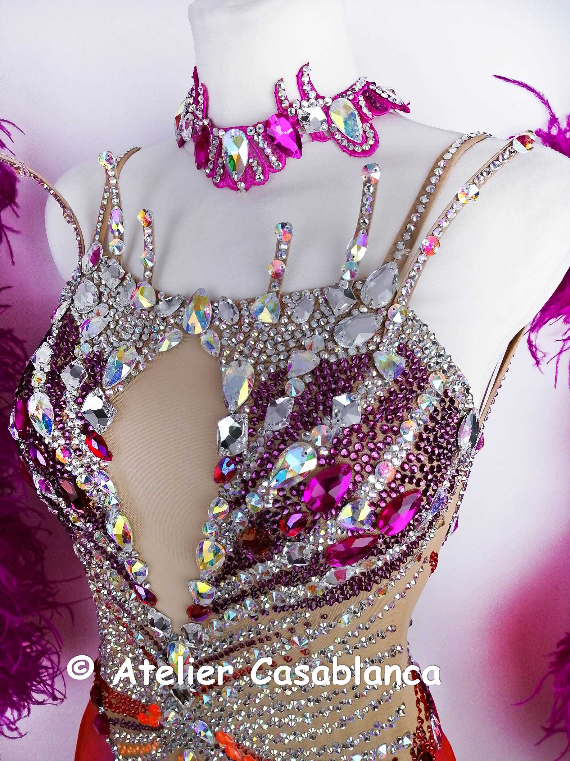 ノースリーブで背中は開くアナスタシア選手お好みのスタイルで、デコルテラインの立ち上がるような石のオーナメントの装飾が大変スタイリッシュです。ベージュのメッシュを使っており、胸元は開かないデザインになっており、左右対称になるようにピンク、オレンジ、クリスタル、オーロラなどの大小の石を贅沢に使って非常に豪華で美しい装飾がされており、大変豪華に輝きます。