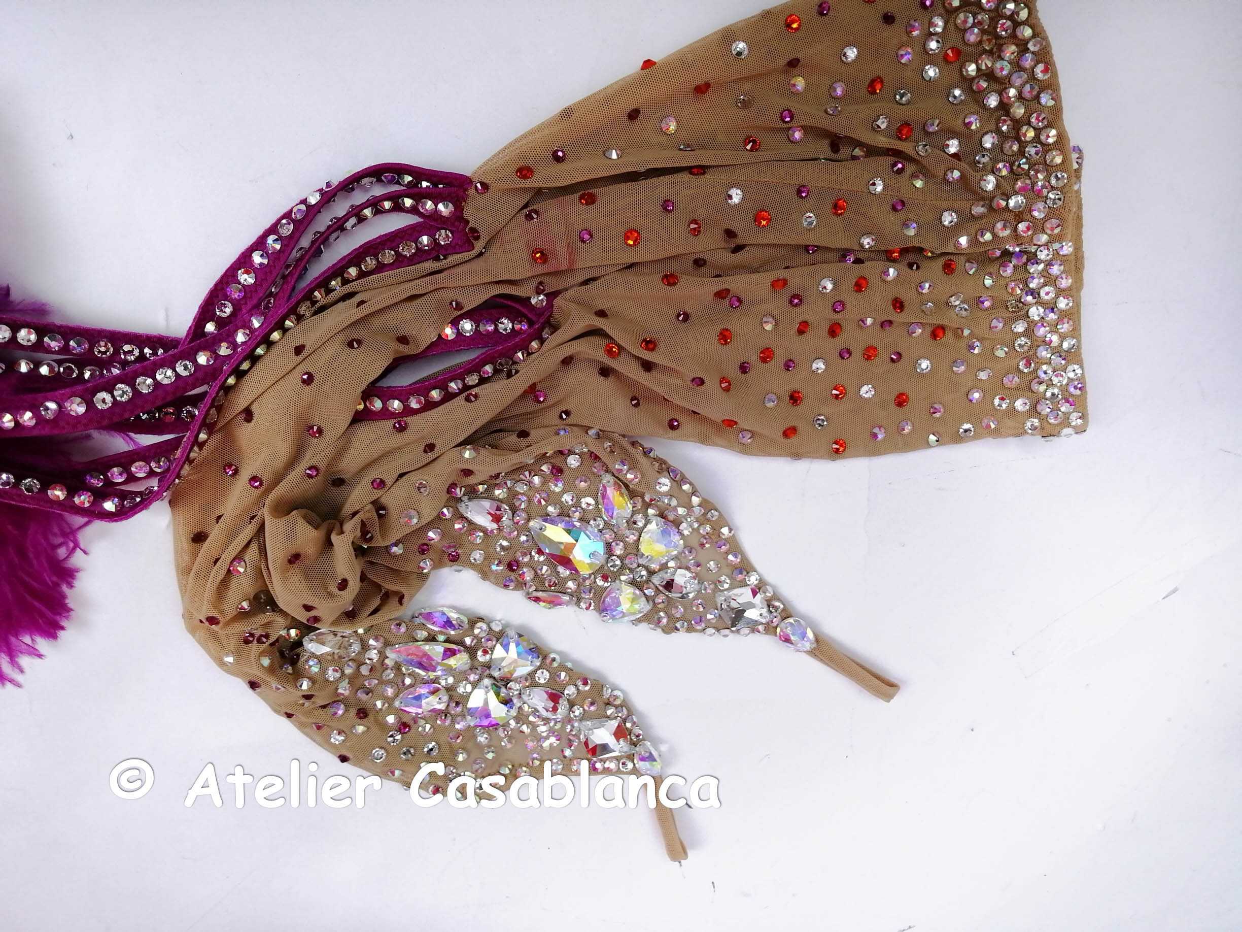 いしの装飾が超豪華で、オーストリッチの羽がチェーンから垂れ下がる美しいグローブが付属しており、さらにオーストリッチの羽のフロートを別途装着する構造になっているので、フロートに大変個性があります。(普通のふわっとしたオーストリッチの羽とボーンが入っているオーストリッチの羽数本の両方が垂れ下がって異なった速度で踊ります)
