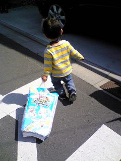 「重そうだからママが持とうか?」というと、怒って自分が持つと・・・ビニールのパッケージが破けないかとハラハラ途中で私がひっくり返しておきました~そしてとうとう家まで持って帰り満足そう~そんな「ちぃちぃ」ももうすぐ2歳になります