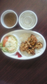 今日も、雲ひとつ無い、気持ち良い天気午前中のお昼ねから、目覚めた娘2号を連れて、銀行へ。いつもは、ベビーカーに乗せていくのですが、今日は、歩かせて見ました。もちろん、1歳の子供なので、全部歩いてくれるわけではないので、帰りは抱っこする覚悟です。行きは、順調。お昼ね後で充電完璧なので、歩くの早い早い。いつもは、30分のところを、1時間かけてへ到着。さあ、ここからは私の番で、もう、すでに疲れてしまった娘を抱っこして家路へ。ちょうど、お昼時だったので、帰りに久々、「はらぺこ弁当」でお弁当。今日のお弁当はこれ。唐揚カレー(お味噌汁付き)530円。潰瘍性大腸炎持ちの私は、カレー等の刺激がある食べ物は、ダメなのですが。好きなものは、どうしても食べたくなる。たぶん、お腹の調子が悪くなるだろうなぁ。。。と、思いつつ食べちゃいました。すご~く、おいしかった。いっぱい、歩いた後だったので、娘2号もビックリするくらいの、食欲。小さいからだのどこにそんなに入るん?と言うくらい、食べてました。やっぱり、運動の後はごはんがウマイ