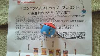 リスカの「うまい輪」についていた応募券3枚集めて、コンポタくんストラップが当たるで当選したらしく、今日送られてきました一通しか出さなかったのに。。。30000名様だったので、当たりやすかったのかな娘の名前で、出したので、自分宛できたのがうれしかったようです。昨日、夕方から下の子が発熱39度を超えたので、さすがにきつそうで解熱剤を入れてあげて、今朝病院へ発疹もなく、のども赤くないので昨日、接種した肺炎球菌ワクチンの影響らしいですなので、薬は出ませんでした。今も、微熱があるので心配です