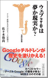この著者・佐々木俊尚氏の本について、昨日書き込んだ時に、Web2.0 という言葉はでてこなかった、と書いたら、今日、本屋で、彼の新しいこの新書本を見つけて、ああ、やっぱりそうだろうなぁ、と思った。「Web2.0」この言葉を使わなかったら、この時期、損だ。