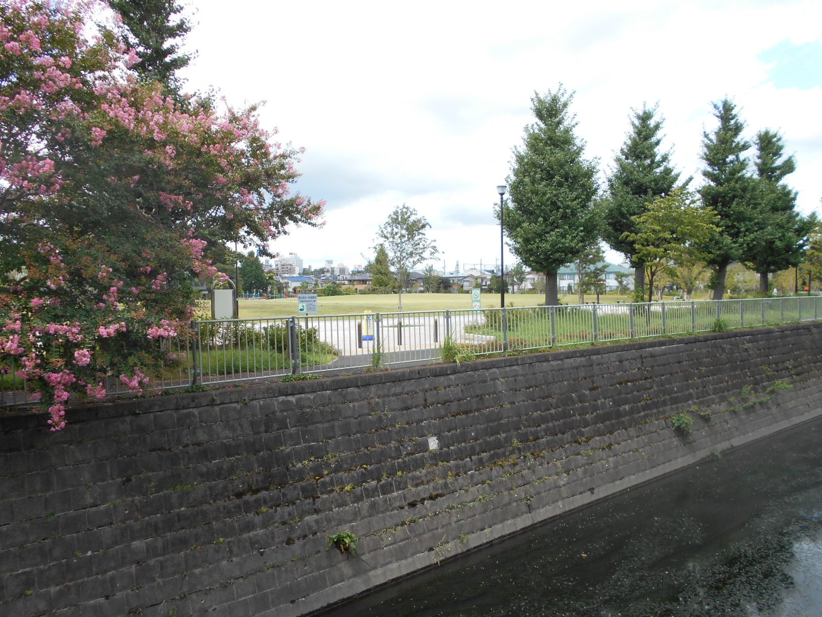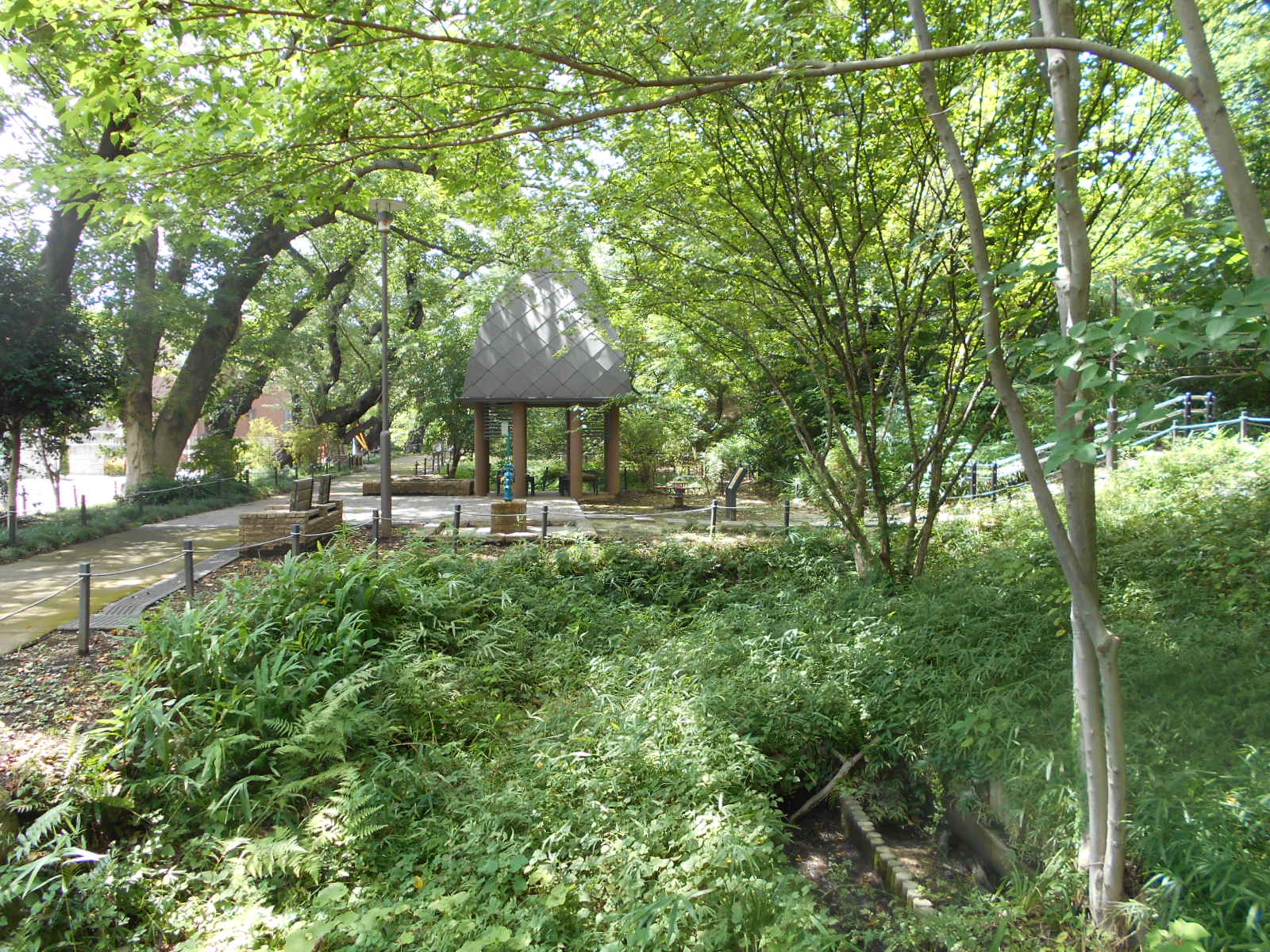 再び神田川に戻り、川沿いの遊歩道を上流に向けて歩きます。やがて左手に、広々とした公園が見えてきました。