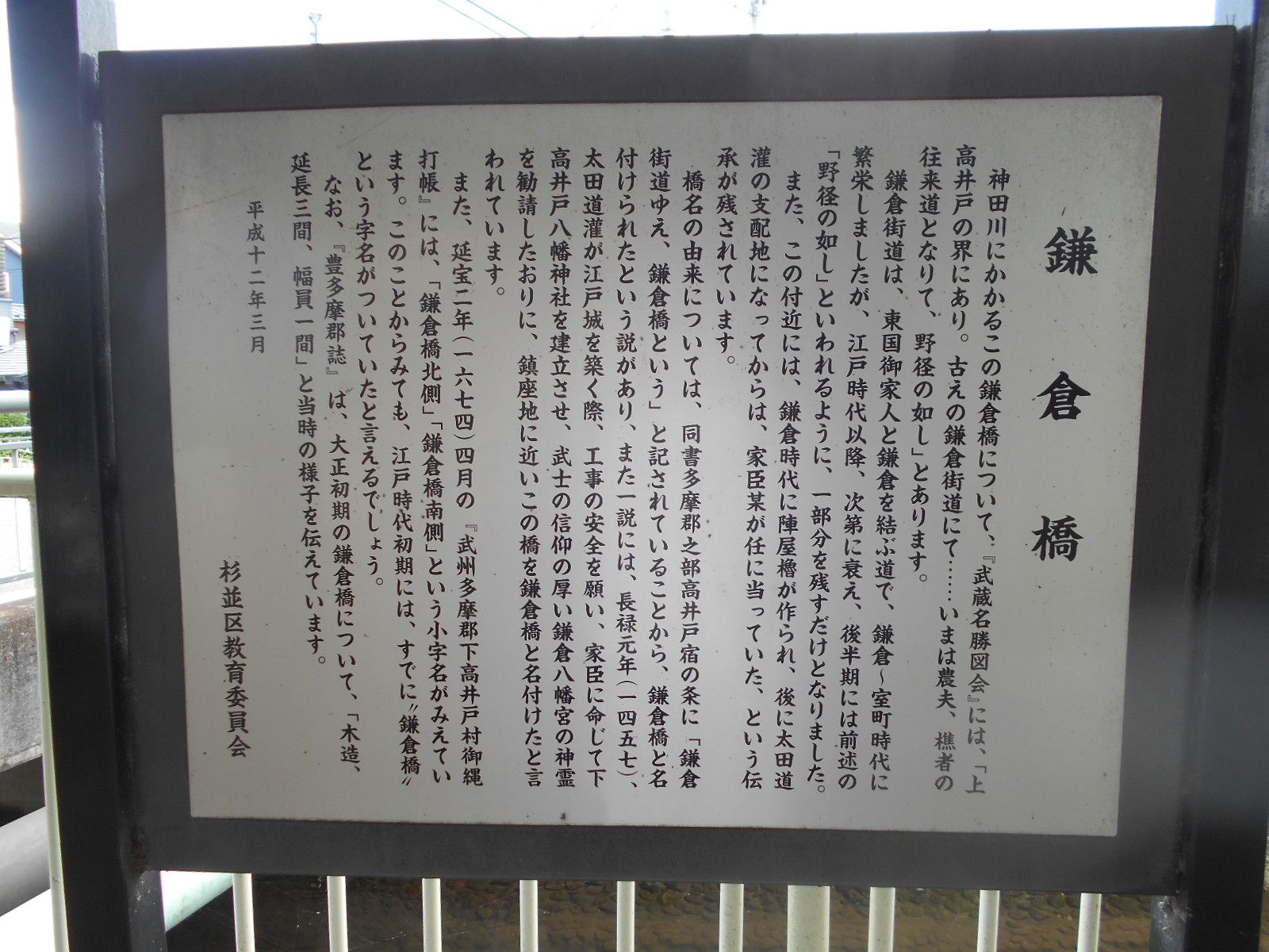 神田川の遊歩道をさらに歩いていくと、鎌倉橋の解説板が立つ橋がありました。