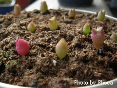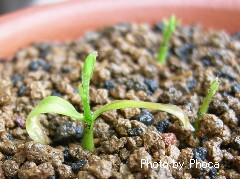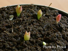 サボテンの実生をはじめて約一ヶ月。ちょっと大きくなってきました。上が赤花兜。長径4mmくらい。下のメロカクタス マタンザナスは2mmくらいかな。生意気にも棘も出てきました。かわいいのぅ。特に兜の実生は興味深い。この形、まさに双子葉類の茎の先端の芽の原基の解剖図そのもの。サボテンはやっぱり双子葉類なんだなぁ。・・・それにしても赤い。ストレスが原因らしいのですが、なにがストレス源になっているのかわからないままに一ヶ月。。。こんなに過保護にしてるのに。過保護にしすぎ?モーツァルトでも聞かせてやろうか?写真撮影の後植え替えました。結構根っこが伸びていてびっくり。一個一個ピンセットで移植して肩がこった。。。腐るなよ~これまでは一鉢に一種類で二鉢だったのですが、一鉢に二種類植えて二鉢に変更。これで育成環境を変えて実験ができます。しばらく養生したら、いろいろ試して最適な環境を探します。