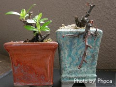 春に挿し木したピラカンサです。左は挿し木成功。右は失敗(泣)。懸崖の面白い形になると期待していたのですが。どこで明暗が分かれたのかは不明ですが、ピラカンの挿し木に失敗する僕って。。。古枝でもほぼ確実に発根すると聞いていたのですが。。。まぁ、気を落とさずにいきましょう。左のは深めに挿しているのでわかりにくいのですが、足元は結構太くていい感じなのです。現在樹高4cmで豆盆栽を目指します!