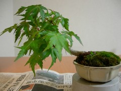 久々に盆栽ネタ。山モミジです。春から展開した葉っぱがこんもりしています。これを・・・きってしまいます。。。もったいないようですが、こうしてやることで、大きさのそろった葉が出て紅葉がきれいに見えるそうです。それに小枝も増えるそうな。葉刈りという作業です。まずは葉柄のところでちょきちょきと葉を落としてしまって丸刈りにします。枝が見えてきたところで、伸びすぎてしまった枝も落としてあらたな芽に期待します。上のほうを押さえつつ、下の段の枝を伸ばして形を決めていきたいところです。2~3週間後には二番芽が吹いてくるそうなので、再び芽押さえをしてやりつつ、紅葉を目指します。この木は、当初構想ではまわし継ぎをして縮小を考えていたのですが、まぁそれはいつでもできるということで、モミジ培養の練習台になってもらうことにしました。木を倒したので、足元から芽を吹くかもしれないしね。本当は先週やるつもりだったのですが、気ぜわしくて手が出せませんでした。はじめれば15分もかからない作業なのですが。。。まぁ、そういうことってありますよね。今週は夜は比較的時間が取れそうなので、いろいろやるぞ~