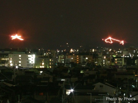 今日は五山送り火(大文字五山保存会のページに飛びます)。今日は五山(大文字、妙法、舟形、左大文字、鳥居)のうち、後ろの三つをみました。写真は舟形と左大文字。(鳥居は遠いのでうまく撮れなかった。。。)学生時代から、極力16日は京都にいてみるようにしていました。当時は貯水槽の上によじ登って見ましたっけ。。。これを観ると夏も終わるなぁと実感します。ま、京都は当分暑いんですけどね。。。