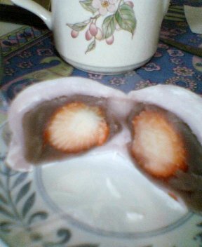 某デパート(頭文字はS)で、江戸情緒展をしておりましたので、仕事帰りに寄ってまいりました。イートインコーナーガあって、105円均一の寿司カウンターに人が並んでいました。でも、私が並んで買ったのは写真の『いちご大福』広島のデパート内にも出店していて、よく売り切れと書いてあるのを見たことはありましたが、食べるのは初めて。春の限定販売らしくて、桜餅といちご大福が人気なようでした。家に帰って早速お茶を入れまして、大福もいつもなら丸かじりなんですが、包丁で半分に切って、中身の写真も撮ってみました。まあなんせ30万画素の写真なので、精一杯美味しそうに撮ったつもりですが、こんな感じです。今まで食べたいちご大福は、いちごの酸味が強くてなんか合わないな~って思っていて特別好きな方ではなかったんですが、これは違いました!上品な味で、いちごと餡がぶつかり合った感じではなく、自然に調和がとれた感じといえばわかっていただけるでしょうか?(味の表現って難しい~)一言で申しますと、『おいしゅうございました』(*^_^*)