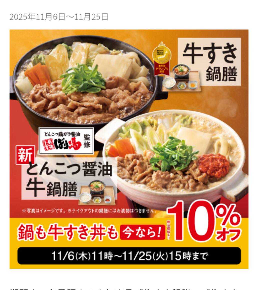 週末のお昼ご飯吉野家へ只今鍋も牛すき丼も10%オフです(一部店舗は対象外ですので確…