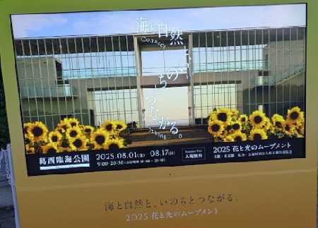 葛西臨海公園のひまわり畑で開かれている2025花と光のモニュメントに行ってきました。ひまわりのライトアップを期待するとちょっとがっかりですが、自然な感じひまわりが夜と調和していていいです。4月の舎人公園のネモフィラライトアップとはちがったテイストでした。適当にパシャパシャ写真を撮って家に帰って観るといろいろ面白く撮れていました。1番上のがお気に入りです。