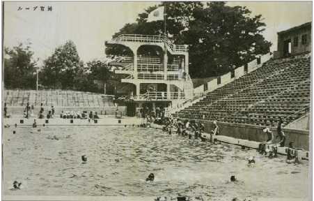 明治神宮外苑にあります。水上日本の名を世界に高からしめる、全日本の水泳選手達が、必ず踏まねばならぬ檜舞台が、この神宮プールであります。全国学生水泳競技大会、全日本水泳選手権大会など、血湧き肉躍る壮快な争覇戦の実況は、その都度こゝから全国へラヂオで放送されます。