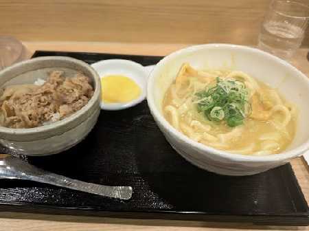 カレーうどんと牛丼のセットを注文。あとで調べたらカレーうどんのスープの残りにご飯を入れて雑炊みたいにして食べるのが流行りらしいです。