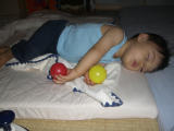 ハルがお昼寝をしている時のこと母がトイレに行っている間ダンナと寝ているハルが2人きりに戻るとダンナが突然「ハルくんたら 遊びすぎだよね~」という『??なんのこと??』と思ってハルを見てみると...「くかーくかー」めちゃめちゃ遊んでる!!右手は野球 左手はゴルフ 足はサッカーそして 傍らではジャビットくんが応援いやー 笑った笑ったちなみに目を覚ましたハルは まずジャビットくんを抱きあげて 話しかけていた「おうえん ありがとう」とでも 言っていたのだろうか