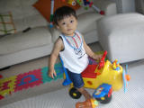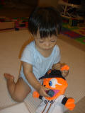 ハルのお誕生日に買ってもらった エアプレーン大変な気に入り様で 毎日必ずこれで遊んでいる様々な遊び方ができるこのエアプレーン音楽を鳴らしたり 手押し車の様に押したり形あわせにチャレンジしたり と ハルも色々と楽しむのだただ 乗って漕いで進む という一番メインの遊び方が 残念ながらまだできないまず 自分でまたいで乗れない乗せてあげても 床に足が届かないなので もちろん漕げないさて 先週末のことダンナがハルを乗せ エアプレーンごと持ち上げて家中を飛びまわる という遊びを繰り返していたハルはこれがとても気に入ったらしくケラケラと笑ってとても楽しそうだったすると 昨日からだろうか一生懸命自分でエアプレーンに乗るようになったのだコロコロと動いてしまうエアプレーンを必死に押さえ短い足を一生懸命持ち上げて 搭乗するのだ無事搭乗が完了すると こっちを見て「さ とばしてよ!」と要求するす すまん 母は飛ばしてあげられないのだよ「なんだ ママじゃだめなのか」と分かると今度は自分で何とか動こうとするまだ残念ながら足が届かないのでうまく漕げないのだが片足で床をチョンチョンしながら 動かそうとはするのだ何だかこの進化が見事で面白くて『次は何をやりだすかな?』と母はじーっと観察してしまうのだったあ もちろんワンパク大王なので前向きだけでは飽き足らず「よいしょ」早速後ろ向きも 楽しんでしまうのだが...