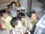 ハルのおうちで 恒例のよちよち大集合今日はなんと 遠く仙台へ電撃引越しをしてしまった愛しのレナールが特別参加!お盆休みでこちらに帰省をしているので1日遊びに来てくれたのだ今日も暑かったので 5人でビニールプールに入ることにしていた母は朝からベランダをキレイに洗い プールに水を張りみんながちゃぷちゃぷするのを楽しみに準備をしたのだが...勇んでプールのそばまで行ったはいいが足をつけたら嫌がって泣いてしまう子眠くて泣いてしまう子そもそも寝ていて起きない子結局プールに入って遊んだのは水遊び大好きな ハル1人だけ...ハルも 最初は賑わっていたのに 気づけば1人になってしまい何だか少し淋しそうだったみんな 次は一緒に入ろうね!早々にプールから上がり お部屋の中に戻ると散り散りバラバラに遊んでいた子供たちが"いないいないばぁ"が始まると わらわらと大集合「くるくるどっか~ん♪」久々の 5人揃ったショット夢中になっているうちに みんな同じ髪型に...「あたまにピーンと!」ともあれ 3ヶ月ぶりのよちよち全員大集合ママたちも とても楽しい時間を過ごせたやっぱり5人がいいわ 次はいつ揃えるかな?