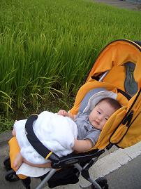 こんにちは。すっかりご無沙汰してしまってすみません。色々ありすぎて何から書けば良いのやら。実家に1週間帰ったあと、こうたろうは離乳食を2回にし始め、更に予防接種(3種混合2回目)あり、6ヶ月検診あり、支援センターで運動会あり、極めつけに夫の誕生日ありで、色んなことが盛り沢山でした。それと、こうたろうが昼間はほとんど寝なくなり(寝ても細切れ)、ブログをゆっくり書く暇もなくなってきてしまい、またまた間が空いてしまったらごめんなさい。 この2週間ですっかり秋になりました。 稲穂も実るぞ。こうべを垂れるぞ。 群馬のお米はゴロピカリ!ゴロゴロゴロ~ 食べてね♪・・・・・・・・・・・・・・・・・・・・・・・・・・・・・・・・・・・・・・・・・・・・・・・・・・・・・・・・・・・・・・・実家での1週間は、こうたろう人生初の電車に乗って友人達に会いに行ったり、 デパートに行ったり、友達が家まで来てくれたり、 姉や甥っ子達に会ったり、盛り沢山であっという間でございました。 こうたろうもずっと興奮状態で、群馬に帰ってからもしばらく 抱っこしろ攻撃が続き、お母さんは大変でございましたよ。 その1週間で1回転寝返りできるようになった こうたろう課長 えへへ。 ぐるんぐるんで、どこまでも行っちゃうぞ。 おじいちゃんを見るとご満悦の坊ちゃん あはは。おじいちゃん見ると笑っちゃう~ ・6ヶ月検診では、坊ちゃんの体重は9,150gと判明! お座りもだいぶできるようになったのですが、 まだまだ抱っこが中心のホントに重たい我が子。体力勝負の日々が続きます。 ・歯もそろそろ生えそうです。 むずがゆいのか、ずっとブーブー言っており、 こうたろうの前でウキウキダンシングをしてブーブーされると、 ブーイングをされているみたいで、ちょっと悲しくなります。 よだれも大量。 衛生士さんの歯についての説明では、歯ブラシを嫌がらないようにするため、 今から「口に指を入れて、ぐりぐりマッサージをして、何かを入れられるのに 慣れる練習をした方がいい」とアドバイスをもらいました。 それと離乳食のあとは、 最後に必ず麦茶かお水を飲ませて、口をさっぱりする感覚を身に付けさせた方が 今後の歯のためには大事なのだとか。なるほどね~。歯のお話しは非常にためになりました。・離乳食も大食漢坊ちゃんは、何でももぐもぐ食べられるようになってきたので ついに2回に。 それと共にウンチの回数が1日1回→5回位に増え、おしりのかぶれがちょっと心配。 今は「おかゆ」と「野菜裏ごしにしらすやヨーグルトを混ぜたもの」の2品を 毎回上げているのですが、 「初めての離乳食」という本を買って、「脱なんちゃって離乳食」目指して 気合を入れなおしたところです。 ・三種混合の注射は2回目だったのですが、またしても全く泣かず、 すこぶるご機嫌で無事終了しました。 偉いぞ、課長。 10月はポリオがあります。これも泣かずにいておくれ。・・・・・・・・・・・・・・・・・・・・・・・・・・・・・・・・・・・・・・・・・・・・・・・・・・・・・・・・・・・・最近のこうたろう課長は、「こうちゃん」と名前を呼ぶと、喜んで笑うようになりました。 物陰に隠れて、「バー!」とすると、ウキャウキャ笑うようになったので、 1人かくれんぼをよくしてます。(でも見てないと、とても虚しい。) オシリふきケースの蓋も、夫が教えた成果か、 1人でボタンを押して開けられるようになったり。 これは天才かもしれません。 なんちって。 ぐずっても絵本や、おもちゃでだいぶごまかせるようになってきました。 1人で、ティッシュの箱をかぶって喜んだりしてます。 特に仕事から帰宅した夫の顔を見て浮かべる満面の笑みには、2人ともノックアウト。 親バカまっしぐらです。・・・・・・・・・・夜中に何度も起きたり、家事や料理をする頃ぐずったり、相変らず大変なことも多いけど、こうたろうの成長が目に見えると、その表情を見てるだけで楽しくなっちゃう今日この頃。成長も嬉しいですが、今が一番かわいい時期なのかなと思ったりして、まだまだ赤ちゃんでいておくれとも思う複雑な秋の日々でした。・・・・・・・・・・・・・・・・・・・・・・・・・・・・・・・・・・・・・・・・・・・・・・・・・・・・・・・・・・・・・・・・・・・・・・・・・・またまた長くなってしまってごめんなさい。毎日色んなことがありますが、体調だけには気をつけて、 食欲の秋を楽しみたいですね。ではでは。皆さんもいい10月を!