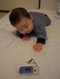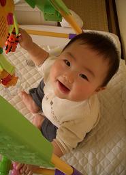 こんにちは。またまたご無沙汰してしまってすみません。こうたろうの目覚しい成長のもと、夏の疲れと睡眠不足か、ちょっと体調を崩したりして、バタバタしておりました。睡眠不足は相変らずですが、体調はだいぶ復活!しかし、一体いつまで夜中の授乳は続くのでしょうか。未だに2~3時間おきに起きて、寝ぼけながらパイパイをくれと泣く坊っちゃん。これはひょっとして夜泣きの一種か。パイパイをあげると、割とすんなり寝るし、本人は寝ぼけてるのでいいのですが、その度に私は起き上がらなければならず、喉も渇くしなかなか大変でございます。最近、昼間が妙に眠くて眠くて、睡眠の大事さを痛感する今日この頃。・・・・・・・・・・・・・・・・・・・・・・・・・・・・・・・・・・・・・・・・・・・・・・・・・・・・・・・・・・・さて、そんなこうたろう坊ちゃん、7ヶ月を迎え、ついにハイハイをし出しました!と言っても、まだずり這いで、一生懸命頑張って50cm位前に進む程度ですが。気になるおもちゃなどを手前に置くと、必死になって前に進もうともがきます。最初はぐるぐる回転したり、もがくあまりに後ろに下がったりしてて、なかなか面白かったのですが、この2、3日で一気に前に進むようになりました。気づくと使用前のオムツやスリッパをかじったりしていてますます目が離せなくなった坊ちゃん。うーん、恐ろしい。特に私の携帯にぞっこんラブで、携帯を見せると鼻を鳴らして突進します。私が喋ってるのを見て、中に小人が入ってるとでも思っているのでしょうか。他のおもちゃとは明らかに目の輝きと興奮度合いが違います。0歳から携帯がおもちゃなんて、私の時代には考えられませんでしたよ。でも、おもちゃにする時は電源オフにしているので、最近本来の目的を忘れつつある携帯君。かじられてごめんよ。 携帯に猛烈にアタックするこうたろう課長 あ!目標発見! 突撃しなきゃ!・・・・・・・・・・・・・・・・・・・・・・・・・・・・・・・・・・・・・・・・・・・・・・・・・・・・・・・・・・・・・・・・お座りもすっかりマスターして、友人にもらったジムで、お座りしながら遊べるようにもなりました。(3分位1人遊びしてくれるので、トイレに行く時便利です。) ジムでご満悦のこうたろう課長 いらっしゃ~い♪ 何かごようかな~?・・・・・・・・・・・・・・・・・・・・・・・・・・・・・・・・・・・・・・・・・・・・・・・・・・・・・・更に、ついに下の歯が1本生え始めました!2本目もちらほら見えています。それと共に、ウワサには聞いていた「パイパイを上げる時の激痛」も経験しております。噛むと痛いのなんのって。特に寝ぼけてる時によく噛むのですが、それはそれは飛び上がるほど痛いです。思わず怒りたくなってしまう私。上の歯も生えたらどうなってしまうのでしょうか。今から恐ろしい。 歯がかゆいらしいこうたろう課長 うーん、いいかみ心地だ。ちなみに手前のタオルのおもちゃは私作成。ミニタオルで鈴をくるみ、輪ゴムで両端をしばっただけのもの。リンリン鳴るし、タオル好きな坊ちゃんには意外と好評です。・・・・・・・・・・・・・・・・・・・・・・・・・・・・・・・・・・・・・・・・・・・・・・・・・・・・・・・・・・・・・・・・そんなこんなで、白湯をコップで飲めるようになってきたり、おもちゃを取り上げると泣いて怒ったり、色々と成長が目覚しいこうたろう課長。成長は嬉しいのですが、自己主張もかなり激しくなって、ボーっとしてる時間がほとんどないので、なかなか毎日大変です。夫の協力なくしては、なかなか乗り切れませぬね。こうたろうの相手だけでなく、家事をやってくれたりもする夫。感謝感謝でございます。でも、きっと私もこうたろうと一緒に成長しているんだろうな。この秋の夜長、夜空を見上げたり、甘いものを食べたり本を読んだり、自分のためにリラックスする時間をなるべく持って、私も心に余裕を持とうと思います。・・・・・・・・・・・今日はいつにも増して長くなってしまってごめんなさい。4日分くらいの分量でお届けしてしまいました。また間がかなり空いてしまうと思いますが、懲りずに寄ってくださいね。ではでは。体調にはくれぐれも気をつけて。いい秋を。