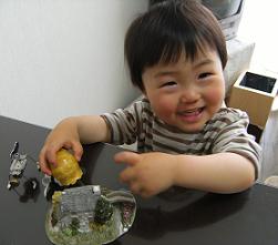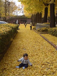 僕、9ヶ月になったよ!こんにちは。すっかりご無沙汰してしまい、気づけば1ヶ月以上も間が空いてしまいました。ホントにごめんなさい。こんなに空いちゃったらみんなもう読んでくれないかもなと一人思いつつ。この間色んなことがあり過ぎて、パソコンを開く余裕もあまりなく、あっという間に気づけばもうクリスマス。そして年末。そしてこうたろうも20日で9ヶ月を迎えました。パチパチパチ。早いものですよね~。しかし何から書けば良いのやら。・・・・・・・・・・・・・・・・・・・・・・・・・・・・・・・・・・・・・・・・・・・・・・・・・・・・・・・・・・・・・・・・・・・・・・・まず、11月末に友人の結婚式が東京でありました。私は初めて夫にこうたろうを預けて出席。といっても会場まで車で夫もこうたろうも同行し、離れたのは3時間半程度だったのですが。それまで1時間以上離れたことがなかったので相当ドキドキだったのですが、夫の散歩&お茶&絵本攻撃で、こうたろうは無事に一度も泣かずに乗り切りました。再会した時、坊ちゃんはさぞ笑顔で迎えてくれるのかと思いきや、「あれ?いなかったっけ?」てな感じでかなり拍子抜け。私は複雑な心境でしたが、夫は2時間以上歩いたり、相当頑張った模様。坊ちゃんと夫の絆も深まったようで、なんだか誇らしげでした。その頑張りに感謝しつつ、結婚式はいいものね~と初心に返った一日でした。しかしストロー飲みを教えておいてホントに良かった。それから親友の出産。これは別に私が立ち会った訳ではないのですが、一番身近な友達なので、臨月の頃からいつ産まれるかとドキドキしてました。今旦那様がアメリカにいるのですが、2日間だけ日本に帰国して、なんとその2日の間に産まれたという、嘘みたいなホントの話。無事に立会い出産できたそうです。「赤ちゃんって分かってるのね~。すごいな~。」とじーんとアンビリバボー。・・・・・・・・・・・・・・・・・・・・さて、いい話はそれくらいで、その後です。怒涛の風邪攻撃!まず、こうたろうの夜泣きが3日間続いた後、私がなんとなく具合が悪くなり、次の日には熱が8度まで上がり、更に次の日には40度まで一気にどーん!もうびっくりぶったまげです。近くに住んでいる夫の母に会社を早退してもらい、病院に連れて行ってもらったり、こうたろうの相手をしてもらうはめに。夫も仕事を切り上げて早めに帰宅。夫の会社は12月が1年で最も忙しいのに、そんな時期にとほほです。お母さんは3時間位おんぶして近所を歩いたり、リンゴをすってくれたりしてくれました。その周囲への影響力の大きさと情けなさと、申し訳なさにお母さんの前で泣く私。私は体調が悪くなると極端に気弱になるのですよね。夫も鍋を作ってくれたり、東奔西走。授乳中で薬は飲めないので、病院からもらった座薬の解熱剤を入れて、なんとか熱は下がり、気合で復活しました。原因は疲れだったようで、今話題の「ノロウィルス」ではなかったと思うのですが。母は簡単には風邪を引いちゃいけないことを痛感しました。その間、坊ちゃんは私が寝ているところに覆いかぶさってきたり、大活躍。ほっとしたのも束の間、今度は夫が正真正銘の「ノロウィルス」にやられました。会社で流行っているそうで、一晩中くだってしまい、熱も少し出て、うなる夫。夫はめったに風邪を引かないので、私は右往左往状態。でも、基礎体力が違うのか1日で会社に復帰。良かったですが、疲れがたまってる様子でちょっと心配。 そんなこんなで、私も少しは休養が必要だということで、その1週間後の12月中旬、3ヶ月ぶりに東京の実家に帰省しました。 実家の近所の公園は もみじのじゅうたんに。 うわ~なんだこの黄色。 いとこ達囲まれて。 これ、何だか分かるかい? 2番目の姉一家も来て、甥っ子姪っ子と公園で遊んだりして、前半は非常に楽しかったのですが、なんと、3日目に今度は私の父が「ノロウィルス」にやられ、次の日には母と、会いに来ていた一番上の姉に感染。部屋から外に出られない状態となりました。その感染力にびびる私とこうたろう。私はこうたろうを背負いつつ、家事をしたりして、なかなか大変なことに。今回は短い日程で帰る予定だったのが、結局1週間以上いることになりました。でも、何より驚きだったのが、私や夫や両親が風邪やらノロウィルスにやられて、ぶっ倒れていく中、ず~~っとこうたろうが元気だったこと。 鏡でご満悦な坊ちゃん。 うん、僕はずっと元気なんだよね。不思議だよね~。ホントにおそるべし母乳の免疫効果です。母乳育児は大変なことだらけですが、ここまで免疫の効果があるのを目の当たりにすると続けてよかったかなと思ったりしています。ま、こうたろうの場合はお腹のまわりにたっぷりついたお肉も風邪菌をブロックしているのかもしれませんが。・・・・・・・・・・・・・・・・・・・・・・・・・・・・・・・・・・・・・・・
