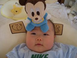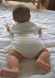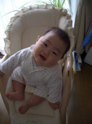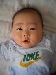 こんにちは。こちら群馬県は今日は曇りです。九州地方は豪雨で大変だそうですが、こちらは梅雨だというのに、曇りばかりで雨が降らないので渇水が心配です。そんな中、こうたろうは、午前中はよく寝ております。曇りだと寝る確率が高いような気がしますが、それは家の子だけでしょうか?・・・・・・・・・・・・・・・・・・・・・・・・・・・・・・・・・・・・・・・・・・・・・・・・・・・・・・・・さて、一昨日、嬉しいお届け物がありました。前の会社の同期の友人達からのプレゼント。こうたろうの服と、私の服です↓。こうたろうだけじゃなく、私のものまで入っていて感謝感激!こうたろうの服は75cm~85cmのサイズだったんですが、今ぴったり。でも、友人から聞いたところによると、80cmはなんと1歳のサイズだとか。そんなに早く大きくならなくてもいいんだよ、こうたろう。 「僕、そんなに大きいの?」 「風呂上りに小躍りする私」みんなそれぞれ個性的で知的でパワフルな女性達。アンテナも常に色んな方向に伸びていて、とても刺激を受けるし、すごいな~と尊敬しつつ、群馬にいても支えてもらっています。会社を辞めて5年が経とうとしていますが、みんなに会えただけでも勤めて良かったなとしみじみ思ったりする今日この頃でございます。・・・・・・・・・・・・・・・・・・・・・・・・・・・・・・・・・・・・・・・・・・・・・・・・・・・・・・・・・・・・・さて、そんなデカベビーこうたろうも、最近ようやく首が座ってきたようです。こんなに太い首なのに、首すわりが遅かった我が子。おんぶもできないし、常に抱っこでお母さんはとても大変だったよ。首すわりのサインの一つが、「うつぶせにすると頭を持ち上げる」ということなので、試しにやってみると、「ウキャキャ!」と言いながら必死で持ち上げていました↓。 「へい! 何か、御用ですか?」それ以来、なぜか1人で必死に寝返りの練習をしているこうたろう。できないとイライラして威張りだします。あっという間にハイハイし出しそうで、ちょっとこわい。・・・・・・・・・・・・・・・・・・・・・・・・・・・・・・・・・・・・・・・・・・・・・・・・・・・・・・・・・・そして、最近非常によく指をしゃぶります。時にはこぶしまでしゃぶって嬉しそう。3ヶ月ごろの指しゃぶりは、首すわりが近いというサインだったり、「自分の指だということを確認している」のだとか。人って自分の指ってことも最初は分からなかったりするんだ、と妙に感動。 たまに朝青龍に見えるこうたろう課長↓ 「おいしいんですけど、それが何か?」そんな首すわり指しゃぶりこうたろうとの最近の遊びは「マトリックスごっこ」。「シュビ!シュビ!」と言いながら、直立する真似をさせると大喜びします。でも、きっとあっという間に大きくなって、来年の今頃はホントに立って歩いてたりするのかな、と思うと、毎日大変ではあるけれど、この成長は見逃すまじと思ったりする今日この頃です。・・・・・・・・・・・・・・・・・・・・・・・・・・・・・・・・・・・・・・・・・・・・・・・・・・・・・・・・・・・・そんなこんなで、来週はちょっと忙しくて更新できないかもしれませんが、また寄ってくださいね。いい週末を~!