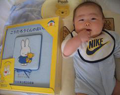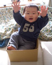 こんばんは。すっかり明けてしまいましたが、おめでとうございます♪皆さん、お元気でしょうか。こちらはついにこうたろうの攻撃にやられて、パソコンが壊れたもようで、電源が入ったり入らなかったり、いきなり強制終了したりと暴れております。間が空いてしまってごめんなさい。でも、今日はVAIO君の調子がいいのと、珍しくこうたろうが早く寝て、更に夫が新年会で遅いので、やっとやっとブログを書く時間が持てました。最後まで、強制終了しませんように・・・。・・・・・・・・・・・・・・・・・・・・・・・・・・・・・・・・・・・・・・・・・・・・・・・・・・・・・・・・・・・・・ さて、こうたろうは明日で早10ヶ月。 相変らずとても元気です↓。 えへへ。 明けましておめでたい! 今年もよろしくね♪お正月は、夫の実家で夫の弟君達に会ったり、支援センターで餅つきを体験したり、初の新年を満喫した坊ちゃん課長。我が家はとても狭いので、つたい歩きしまくりで、転んで色んな所に頭をぶつけたりしております。おばかになっちゃったらどうしよう。 ただ今いたずら中↓。 ここは僕の休憩スポットさ。 新年早々米びつをひっくり返し、私があわあわ言いながら米粒を拾い集めている周りで、ウキャーと言いながら生米を食べてたり、私の背中でつかまり立ちをしてずっと離れないので、「そんなにお母さんが好きなの~?」とよく見たら、必死でセーターの毛玉を食べてたりしています。これじゃまるで猿の親子です。甘えん坊っぷりも更に激しくなり、1人遊びにはすぐ飽きて、ほふく前進しながらすごいスピードで追いかけてきます。特にダメと言われているトイレと風呂場に興味津々な困った坊ちゃん。私が入ると、一目散に突入してきます。とほほ。3回の離乳食もガンガン食べるようになり、ようやく日中のパイパイの回数も減ってきました。夜の授乳は相変らずですけどね。人見知りもおさまって、笑顔も更に増えたかな。体重もだいぶ増えましたが。表情で何を考えてるかだいぶ分かるようになりました。バイバイとハイタッチがお得意で、なんだか意思の疎通ができたみたいで、私のほうが嬉しくて、何度もやらせたら、しつこいな~とあきらかに迷惑顔をされました。ちょっと悲しい。ちなみに私や夫が鼻をふがふが鳴らすと大喜びします。褒めると必死に頑張る体質は完全に親譲りかな。 てへ。 何か面白いことないかな?・・・・・・・・・・・・・・・・・・・・・・・・・・・・・・・・・・・・・・・・・・・・・・・・・・・・・そんな中、新年の計は元旦にあり。1月1日に立てた目標は叶う確率が高いということで、今年もささやかな目標をいくつか立てました。一番決意したことが、 健康な体づくり。なんだかおじいちゃんみたいですが、私はもともと胃腸が非常に弱いのと、風邪を引きやすいというやわな体質です。でも、子育てはそんなことは言ってられないとつくづく実感した昨年。何をするにも体が資本ですものね。ということで、まずは一日10回腹筋をする。というホントにささやかな目標を立ててみました。そんなことかよって言わないでください。これでいくと1年で3,650回腹筋ができることになりますよね。すごいことです。夫には「大晦日に3,000回やらなくちゃなんて言わないようにね。」と釘をさされているのですが、「3日坊主を恐れるな。」やってみなくちゃわからない。小さなことからコツコツと。な~んて言って、すでに今日で3日さぼっております。とほほ。今日は今から40回やります。書いたからには絶対に。頑張るんです。ちなみにこうたろうがいて、夫婦でできるスポーツもただ今探し中。卓球?ゴルフ?バトミントン?空手なんてのもありますね。私ができる唯一のスポーツはテニスなのですが、坊ちゃんがいたら難しいだろうな~。・・・・・・・・・・・・・・・・・・・・・・・・・後、ささやかな夢としては「こうたろうと一緒に3人でソリをする。」ですね。スキーもスノボもかなり苦手で、スキー場ではうどんを食べることが一番好きな私ですが、ソリは大好きです。だって、乗っかって滑るだけなので。なんてったって、群馬県はスキー場の宝庫だもの。あ~こうたろうと一緒にソリに乗っかって雪原を滑空したい。・・・・・・・・・・・・・・・・・・・こうしてみると、なんだか2つとも威張ってブログに書くようなものじゃない気がしてきました。他にもいくつか立てたので、達成できるかは乞うご期待。今年は本ももっと読みたいです。去年は「ソフィーの世界」を読破して以来、ゆっくり本を読む暇がなくなりました。ちなみに漫画はめったに読まない私ですが、今話題の「のだめのカンタービレ」に手を出すかどうか現在検討中。・・・・・・・・・・・・・・・・・・・・・・・・・・・・・新年初のブログなのに、なんだか相変らずおばかですみません。そうそう、13日14日と私の誕生日&結婚記念ということで、