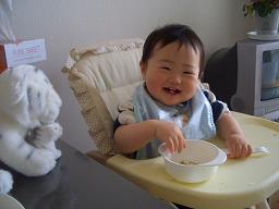 こんばんは。今日は夜の更新です。最近、こうたろうは自分の手の確認は終わったのか、今度は自分の足をベロベロし出しました。更に、人の顔に手を伸ばしてさわるようにもなってきて、私の顔も確認されているもようです。でも、昨日は私の顔をさわっている内に、真面目な顔で鼻に指を突っ込まれ、ちょっと絶句した私。毎日がスリリングです。 ただ今足の確認中→・・・・・・・・・・・・・・・・・・・・・・・・・・・・・・・・・・・・・・・・・・・・・・・・・・・・・・・・・・・・・・さて、我が家のこうたろう課長も8月20日で5ヶ月になりました。そして、その日からいよいよ離乳食を開始!と言っても、3ヶ月検診の時に保健婦さんに教わったのと、本を読んで作っているのでかなり自己流です。最初は、おかゆの上澄みの「おもゆ」からスプーンで一さじずつ恐る恐る上げてみたのですが、これが飲む飲む。「母乳じゃなくてもいいのかい。」と突っ込みたくなる飲みっぷり。 「おもゆ」と「野菜スープ」を交互にあげて1週間様子を見たのですが、ぐんぐん飲むので、その後、「おかゆ」にチャレンジ。これも食べてくれました。うーん、9キロは伊達じゃない。日によって、10さじ食べる時もあれば、3さじ位で嫌がる時もありますが。 ハンカチ王子改め、大食漢小僧です。 「あはは!僕、何でも食べちゃうもんね。」 そこで、私のチャレンジ精神に火がつき、今は色々と日替わりで試したりしています。まだ1日に1回(気分が乗った時は2回)、12時頃か夕方4時頃、なるべく時間を決めてあげています。ただ、今日支援センターに行って、周りのお母様方に色々話を聞いたら、「7ヶ月まではまだ1日1回でいいし、おかゆだけでも充分だよ」とのこと。私はチャレンジ魂と理科の実験のような気分でワクワクしつつ、色々試してますが、まだまだのんびりペースでいこうと改めて思いました。 私が利用している離乳食グッズたち ちなみに私がチャレンジしたものは、こちら。まだ全てドロドロ。そして味付けは、全くなし。「おかゆ」・・・湯のみ(私は病院でもらった「おかゆこがま(写真右)」を利用) に研いだお米を一さじ入れ、水を半分位まで注ぎ、 普通のお米と一緒に炊飯器の中央に置いて、スイッチON! ご飯が炊き上がるのと同時におかゆができている。 (「おもゆ」はその上澄み。)「野菜スープ」・・・味噌汁の具(灰汁の少ない野菜)を煮て、 味噌を入れる前の、上澄みだけをあげる。 (沢山作って、製氷皿に入れて凍らして、 他の食材と一緒にチンしたりしています。) 「パンがゆ」・・・食パンの白いところを少量ちぎり、耐熱容器に水(野菜スープ)と 一緒に入れて、30秒~40秒レンジでチン! 小さい泡だて器やすりこぎでつぶして混ぜるだけ。その他、「かぼちゃ」「じゃがいも」「さつまいも」「トマト」の裏ごしなど。(全て皮をむき、レンジでチン!してお湯か粉ミルクを足し、すりこぎなどでつぶす。)先輩ママさんに聞くと、にんじんやほうれん草の裏ごしはとても手強いらしいです。なので、生協のヤムヤムという乳児用食品の宅配を利用している人が多く、私も現在検討中。ちなみにこうたろうは、かぼちゃがダメだったらしく、私の服はかぼちゃ色に染まり、悲惨でした。とにもかくにも本には一番のポイントは、「気長にゆったり」そして、「笑顔で楽しくあげる」ことだと書いてあり、1口食べるごとに、すごい笑顔で褒めまくっている単純な私。1歳までは母乳だけでも充分育つと言われているので、1口も食べなくても、気にせず、気長にいこうと思う今日この頃です。・・・・・・・・・・・・・・・・・・・・・・・・・・・・・・・・・・・・・・・・・・・・・・・・・・・・・・・・・そんなこんなで、なんちゃって離乳食は始めたばかりで、まだまだ母乳命のこうたろう課長。産まれたばかりの頃は、その授乳回数の多さにパイパイを切り取って置いておきたい位大変だと思ってましたが、来年の今頃はきっと卒乳してるのかと思うと、母乳を上げてる時間もほんの一時で、大切なのかなと思ったりしております。今日も長くなってしまいました。最後まで読んでいただき、ありがとうございます。秋が近づいてきましたが、皆さんも散歩のしすぎには充分気をつけて。ではでは。