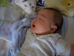 こんにちは。やっと梅雨が明けましたね~。それと共にこうたろうの寝起き?もすこぶる早くなり、今日は4時起き。汗だくで母乳を上げつつ朝日がまぶしい今日この頃です。・・・・・・・・・・・・・・・・・・・・・・・・・・・・・・・・・・・・・・・・・・・・・・・・・・・・・・・・・・・・・・・さて、今日は初めて子育て支援センターに行ってきました!○これは群馬の各保育園で一室を提供し、0歳~3歳までを対象に 保育士が2人ついて、水遊びしたり、絵本を読んだり、してくれるという育児支援サービス。 もちろん無料。 時間は9:30~12:00と1:00~3:00です。 こうたろうも、私がダンスを踊ったり、抱っこしていてもすぐぐずってしまうし、 最近全然寝ないし、 2人きりでいると、電話や夫以外、1日中大人と話さないことも 多いので、意を決して行ってきました。保育園までは歩いて5分。改築したばかりのとてもきれいなところで、2階がじゅうたん張りの広い一室でそこが支援センターになっていました。10時に行ったのですが、既に5人位来ていて、3ヶ月の赤ちゃんもいました。名前を書いて、プログラムをもらって、いざ出陣! 市で行う子育て情報を全てまとめた ガイドブックをもらいました↓。 6ヶ月の男の子を持つスーパーパワフルお母さんとお近づきになり、こうたろうのデカベビーの話題で盛り上がり、保育士さんに抱っこしてもらったりして、まんざらでもないこうたろう。結局12人位のお母さんと子供が来て、大賑わいでした。(平均は1歳位。)途中で泣いたりもしましたが、外にうさぎを見に行ったり、斬新なおもちゃで遊んでみたりして気が紛れ、あっという間に12時。家だと時間が経つのはとても遅いのに、これは驚きです。最後の30分で保育士さんが絵本を読んだり、歌と体操を皆でしたりして、午前中は無事に終了。最初だったので私も緊張しましたが、明日はスイカ割りと水遊びだというので、また行ってみようかなと思っています。そして何より、こうたろうは疲れたらしく、普段は15分位で起きるのに家に帰って爆睡。もうかれこれ母乳も飲まずに1時間以上寝ています。これはすごい!お母さんはそれが何より嬉しいよ。 ただ今爆睡中↓ ※決してお手を触れないでください。 起きると爆発します。 まだまだ私はお母さんの友達はできていないのですが、こういうところがあると、昼間2人きりで子育てを頑張る母さんにとっては息抜きもできるし、非常にありがたいなと思った次第です。・・・・・・・・・・・・・・・・・・・・・・・・・・・・・・・・・・・・・・・・・・・・・・・・・・・・・・・・・・・・・・・・そんなこんなで、 子育ては全ての行動が自分ではなく、子供次第なので、 とても忍耐力がUPしたなと思う今日この頃。 同じ世代でバリバリ働いたり、資格を取ったり持っていたりする友人と話すと、 私も子育て以外にも何か必要かも、と迷ったり焦ったりすることも非常に多いのですが、 頑張る子育て母さんも沢山いるし、何よりこうたろうの母は私以外にはできないと思うと、 また新たにやる気と元気が湧いてきましたよ。・・・・・・・・・・・・・・・・・・・・・・・・・・・・・・・・・・・・・・・・・・・・・・・・・・・・・・・・・・・・・・・・・・・・・・おっと、なんだか独り言のようになってしまったので、今日は最後に夫から出題されて、3日間思い出せず、非常に苦しんだお題を2つ。・映画「氷の微笑」で一世を風靡した女優の名前。・「裸の大将」というあだ名で有名な、切り絵画家の本名。皆さんはすぐ思い出せましたか?私は思い出せた時、「ひゃっほー!」とこうたろうを抱き上げ、メールで夫に威張って感動を伝えました。ではでは。暑くなってきましたが、体調にはくれぐれも気をつけて!