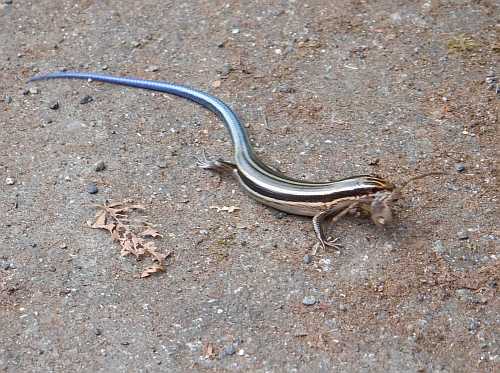 まだ若いニホントカゲに遭遇しました。カメラを向けた直後、一瞬の間に動きがあって、見ると口に何かくわえているのでした。 この写真とは別なカットで、やや大きめのクモの仲間をくわえていたのでした。 でも、それを呑み込もうとして、口から逃げられたのも目撃され、しばらく逃げた獲物を探しているようすが見られた後、再びこの写真のように、クモをくわえた状況が観察され・・・・、 しばらくして見ると、おなががプックリふくれているのがよくわかる状況。無事、丸呑みして食べてしまったようです。 これで、若いニホントカゲ君にとって、今日の日は、食的に充実した夏の一日となったのではないでしょうか。でも、こんな生々しい場面、はじめてでした。 いつも目をかけていないと、目にすることはできないのでしょう。今日はちょっとの時間で、貴重な瞬間が見られてよかったです。
