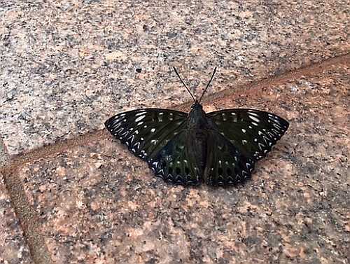 (画像出典: もーん父さんFacebook) 本日午前、博物館の正面玄関前に、タテハチョウ科のチョウ、スミナガシがやってきました。給水のためだったのでしょうか。よくいらっしゃいましたヽ(^。^)丿