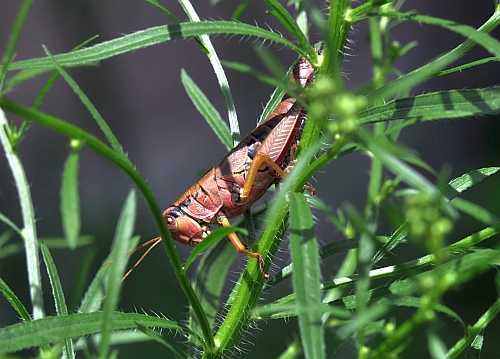 博物館の通用口(利用者の出口専用)の脇の花壇は、今年はわけあってとてもワイルドになっていて、これまでもワイルドガーデンとして紹介してきていますが、そこの植物の1つに、フキバッタの仲間が身を潜めていました。体が赤っぽいので、すぐにその存在がわかってしまいますけど。 顔から胸にかけてをクローズアップです。 最初、羽がとっても小さいので、バッタの仲間の若いヤツとして、取り上げることを考えました。でも、フキバッタの仲間としたら、これで十分です。 ヤマトフキバッタとみるのが一般的ですが、あるいはメスアカフキバッタかもしれません。
