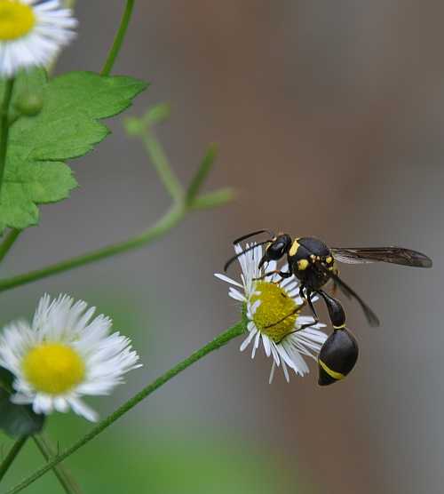 ヒメジョオンの花に、ハチの仲間がきていました。観察の折には、ハナバチの仲間かな、くらいにしか思っていませんでした。このほど、画像をチェックして、その名前を調べてみると、ミカドトックリバチではないかと思われたのでした。これまで、こうした種にはあまり関心をはらってきていないので、確証はありませんが・・・。