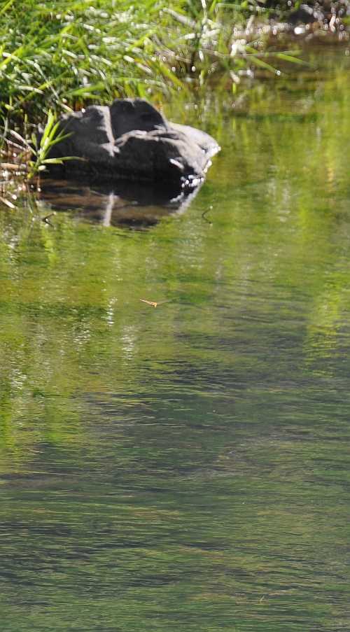 お山に雲が低く垂れ込め、梅雨時のような天気の中、下部川は静かに流れ下っていました。 川の水は、一見よく済んでいて、川底までよく見わたせました。そういえば、川底もきれい。新しい砂礫が供給されたのでしょうか。 2点目の写真のポイントで、大きな平石の上に、小さな魚がやってきたのを目にすることができました。 流れのやや早い場所で、魚影を撮影したのですが、水は澄んでいるものの川面の揺らぎで、よくわかりませんね。画面のほぼ中央に目があって、右手の上流側に向かって泳いでいるのでしたが・・・。