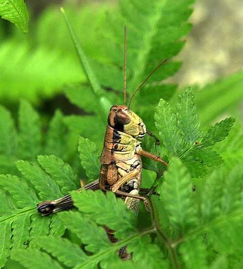 このフキバッタの仲間、右側の後脚、すなわちジャンプする際の一番たいせつな脚が不調のようで、まっすぐに飛べなかったのです。そんなわけで、ねらった場所かどうかわからないのですが、シダの葉のなかに飛び込んでしまった瞬間にごあいさつとなりました。