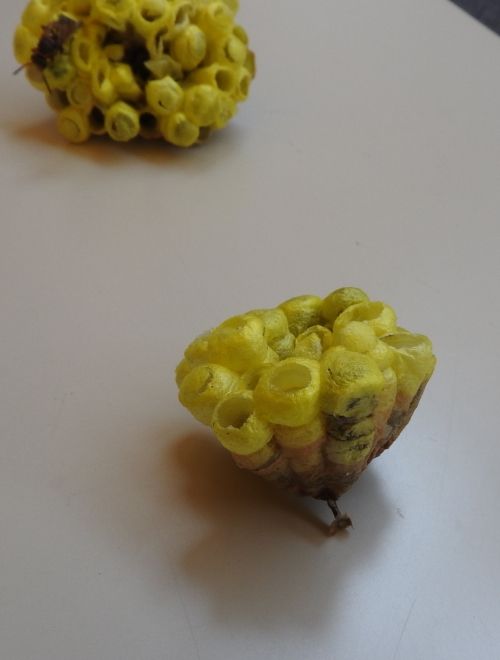 館長に見せたいものが・・・。何でしょう? これでーす。という感じで、この話題が始まりました。黄色い色をした蜂の巣が、屋外のテント下のテーブルの上に並べられていました。見た瞬間、9月15日に紹介したキボシアシナガバチの巣だとわかりました。手前のものが、上の方にあった巣です。そして・・・ こちら、下の方の大きい方の巣です。おや・・・。 以前に退治したしたはずの巣の中から、幼虫が羽化しようとしたようです。こうしたことから巣ごと駆除されたのですが、羽化途中で薬剤攻撃にあって、息絶えようとしているキボシアシナガバチでした。