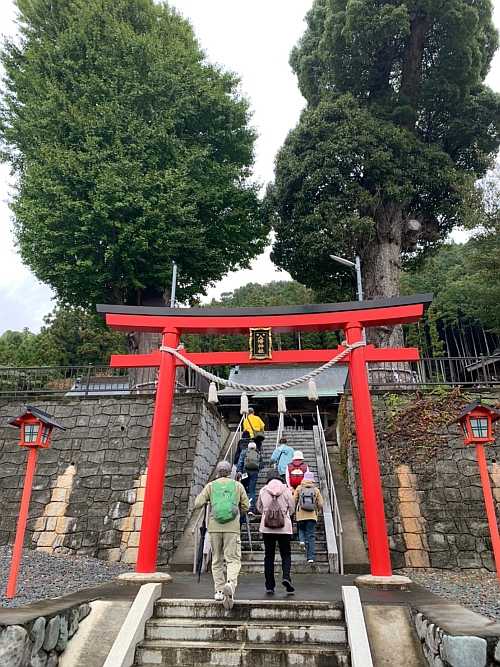 赤い鳥居の参道石段の上の左右の大木ですが、右はクスノキ、左はイチョウで、