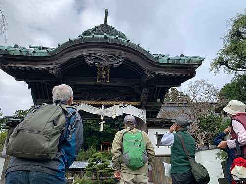 降ってきたので、境内の四阿(あづまや)の下で、八幡神のことや社殿の建築に、