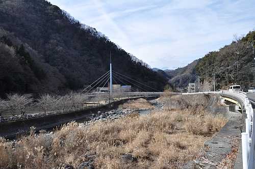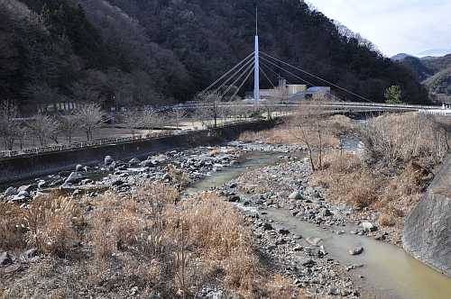ちょっとばかり、上流に移動。メロディーブリッジの主橋塔と金山博物館が